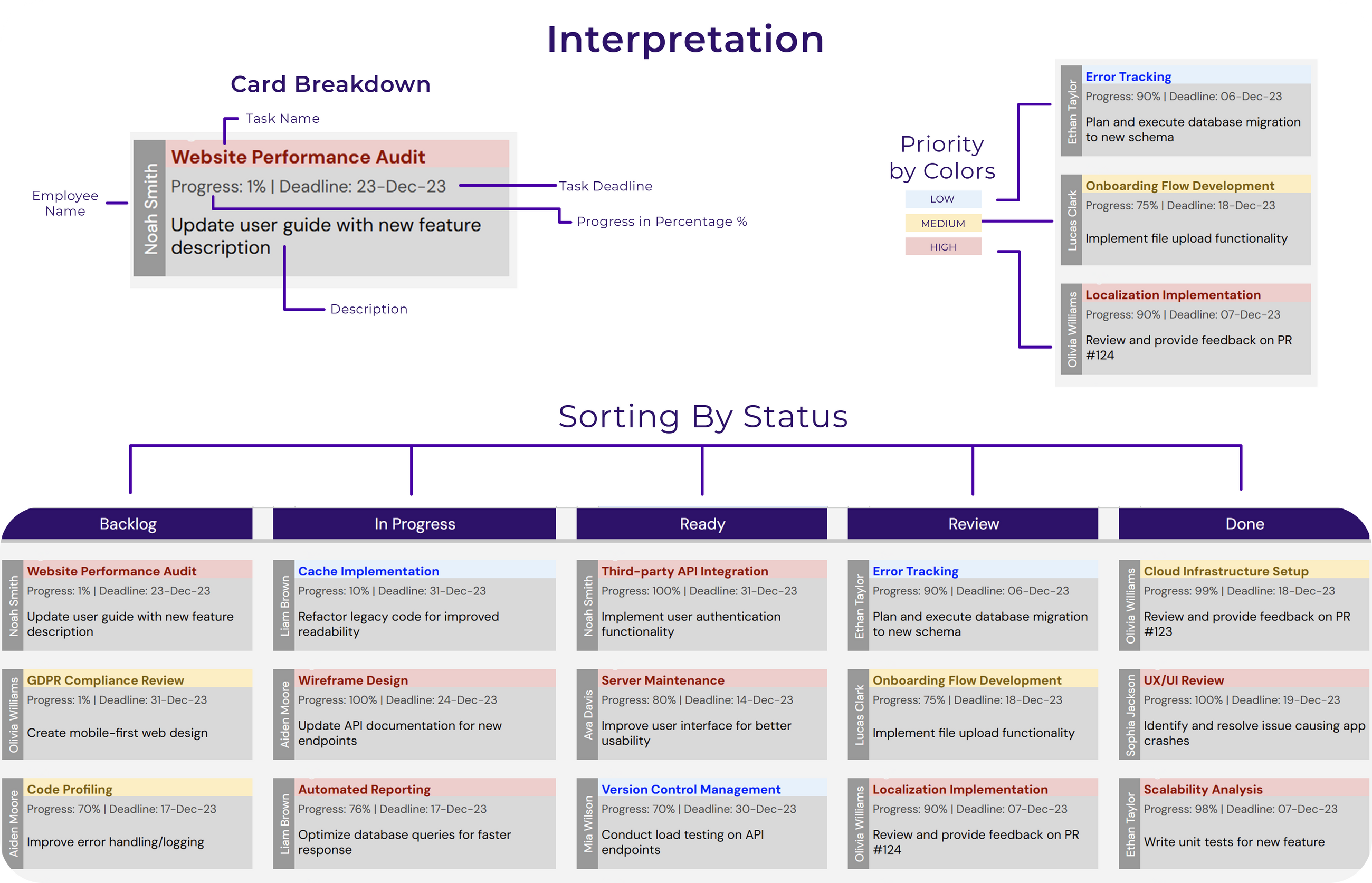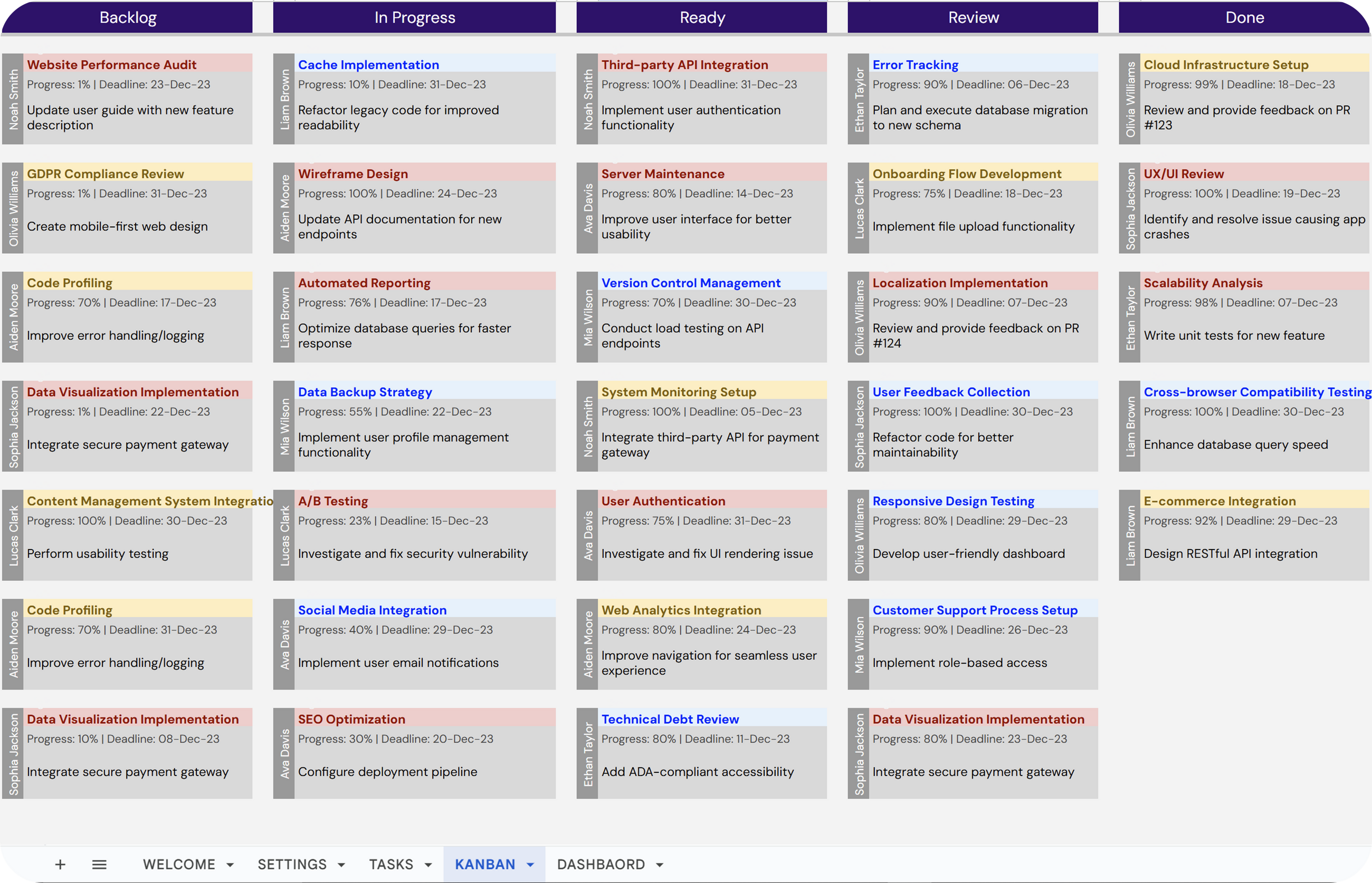 Dynamic Features: Task cards instantly update to reflect changes made in the Tasks tab, ensuring real-time task management and visualization.