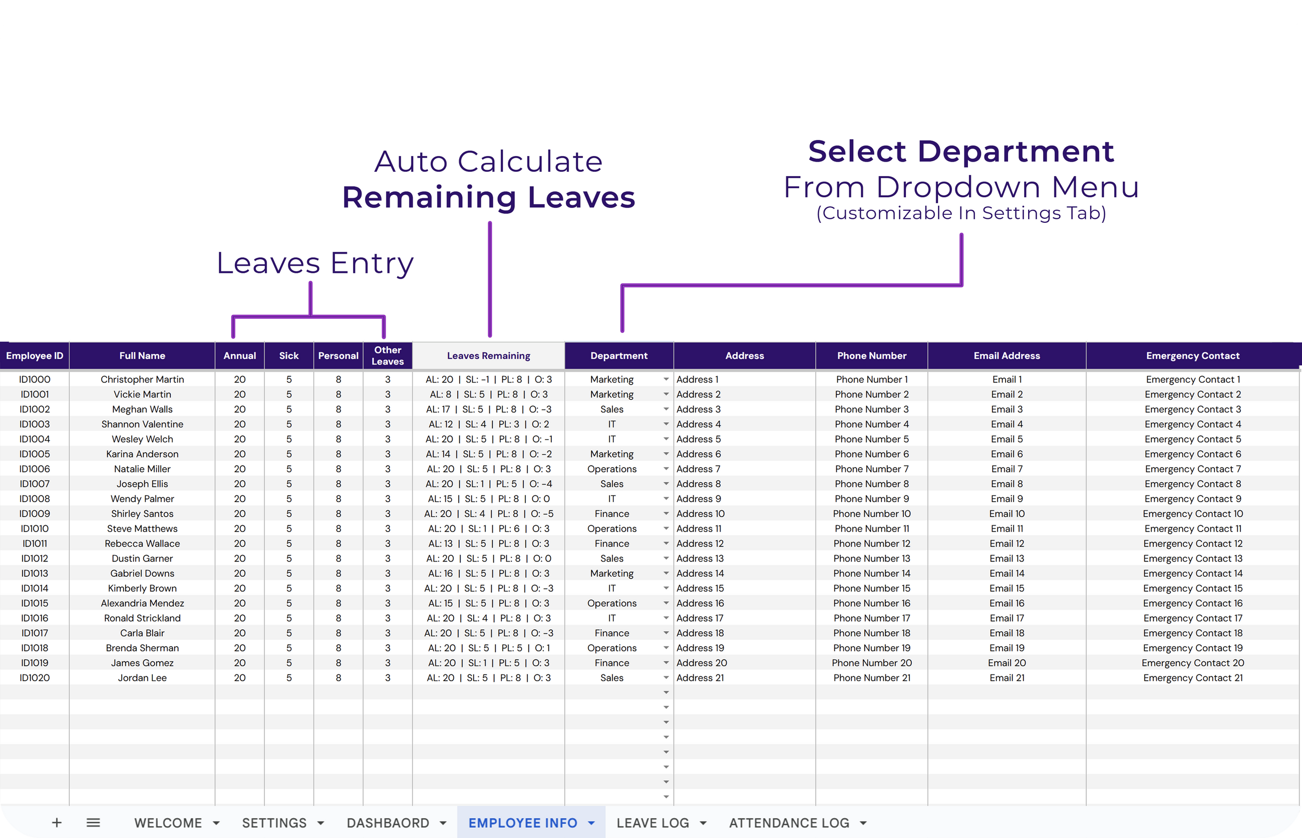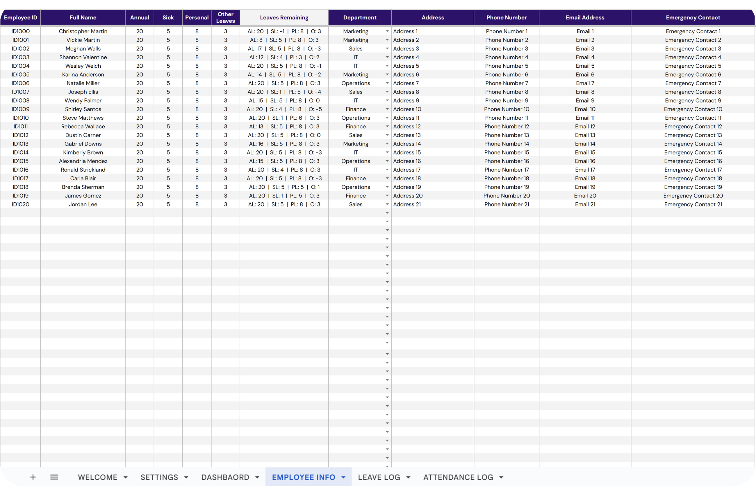 ✔ Comprehensive Employee Details: Includes ID, full name, department, address, contact information, and emergency contacts.