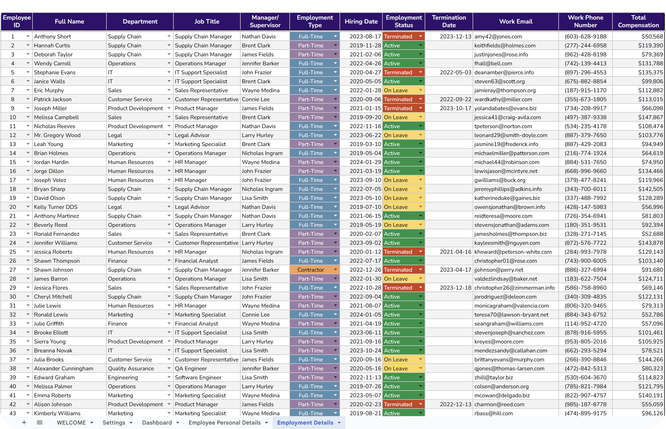 ✔ Status Options: Color-coded employment status for quick reference.