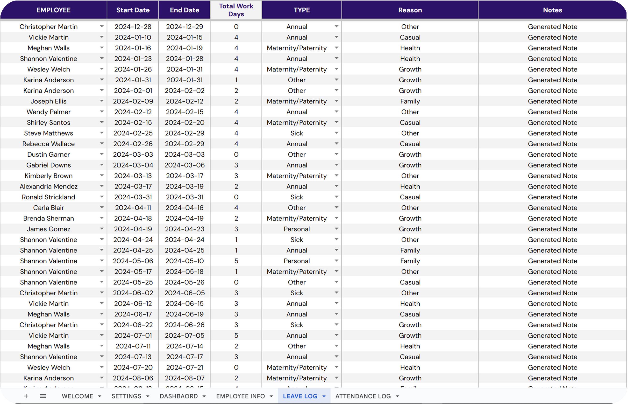 ✔ Total Employee and Leave Overview: Summarizes total workforce and leave usage for easy reference.