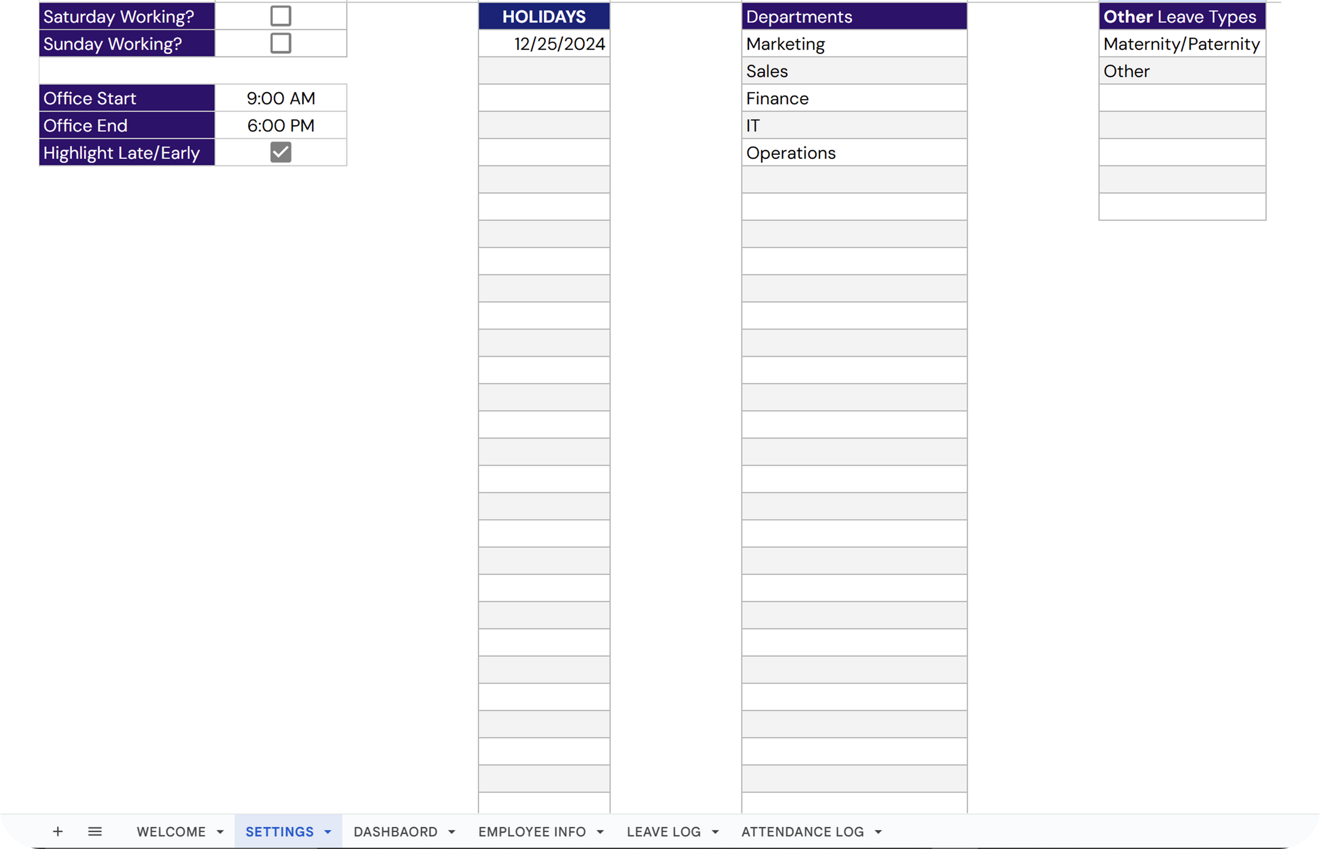 ✔ Holidays: Log in advance for all the upcoming holidays.