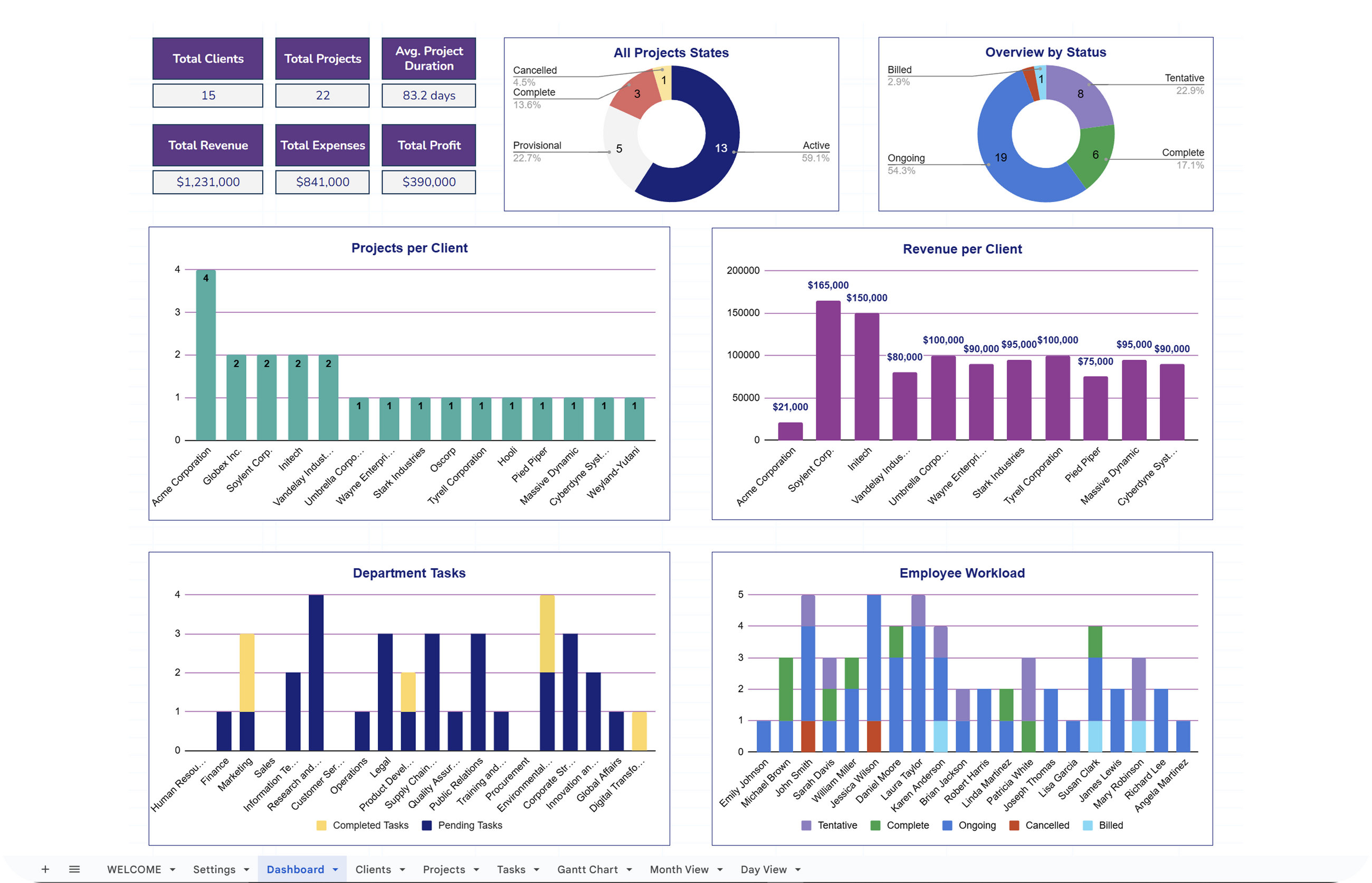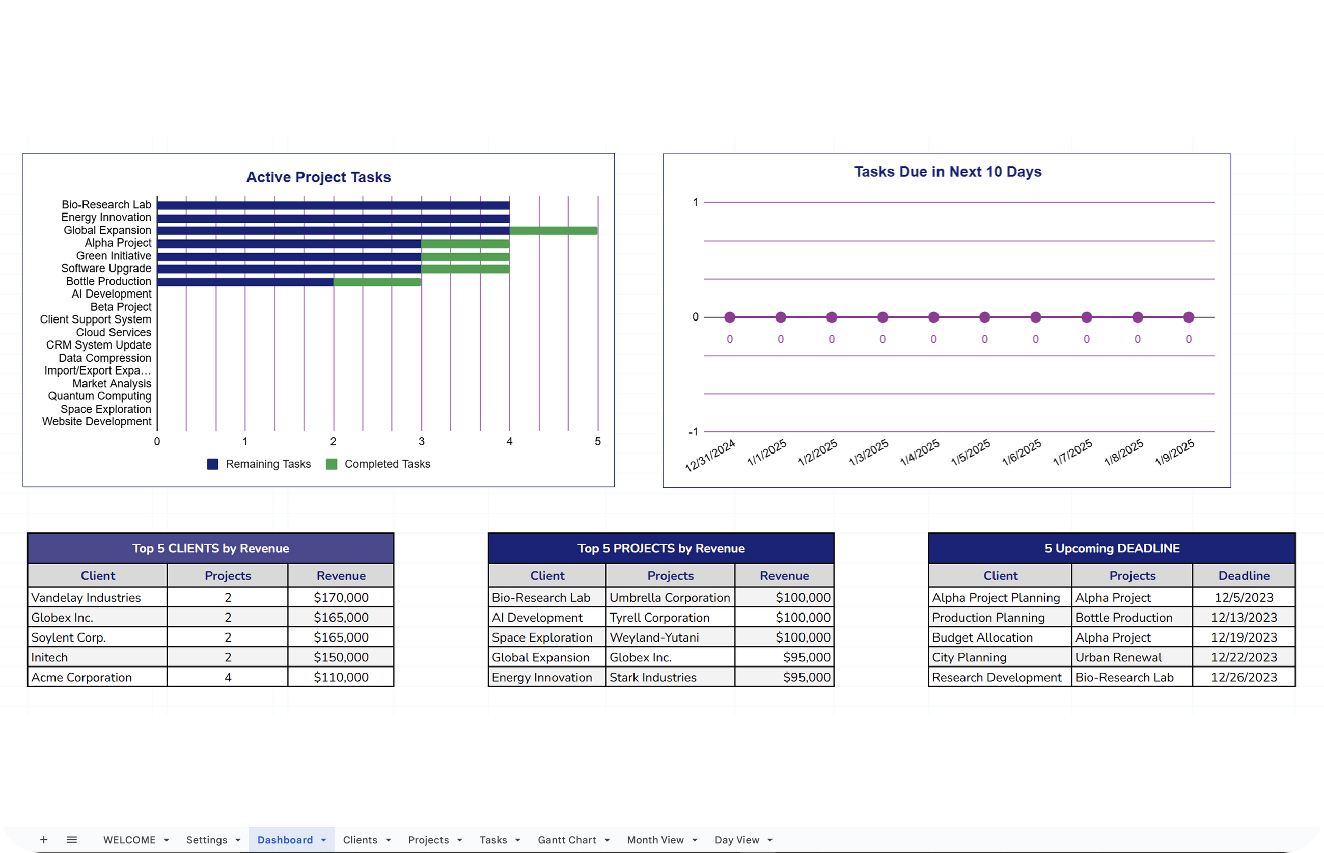 ✔ Performance Rankings & Deadlines: Identify top clients and projects, track impending deadlines.