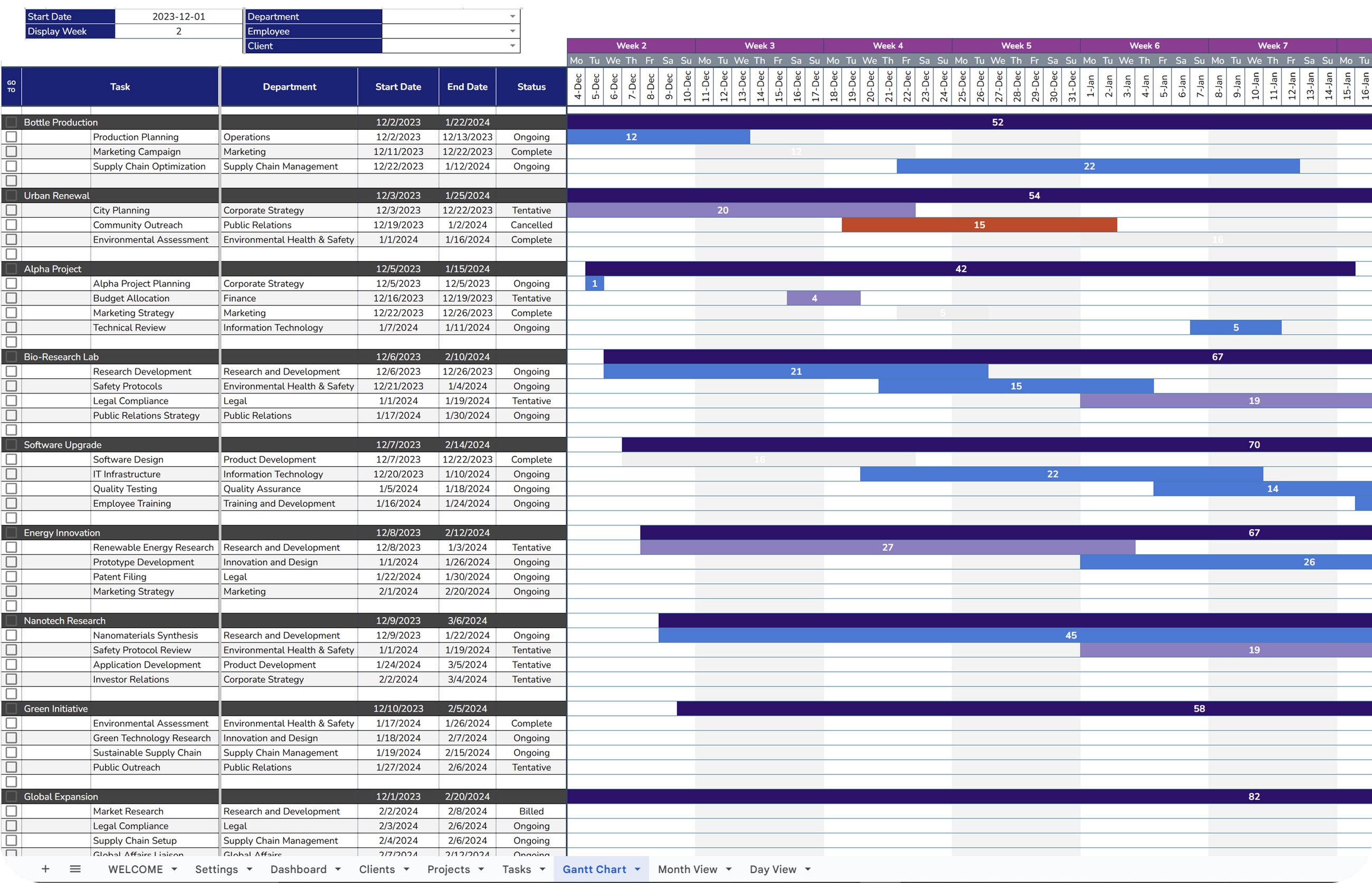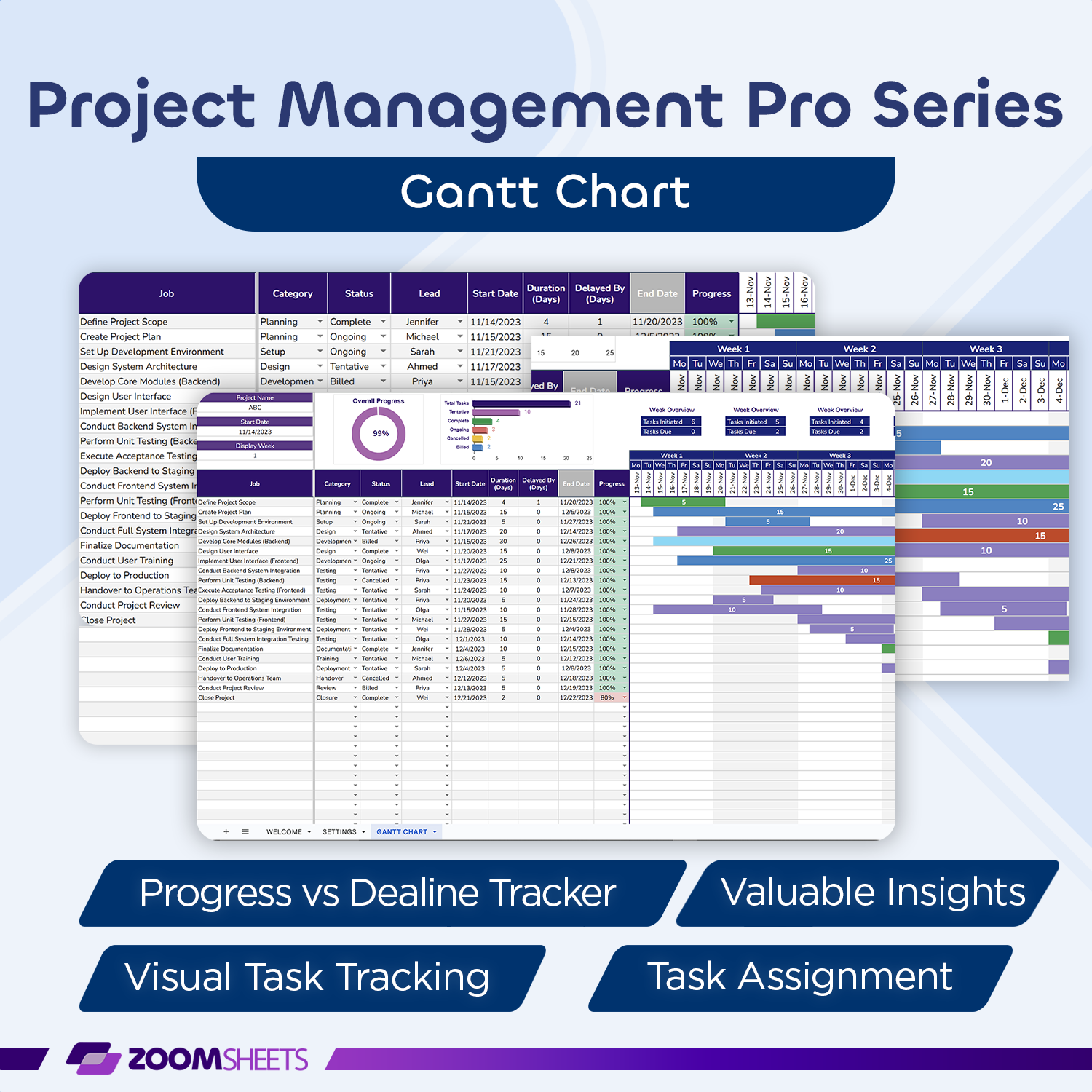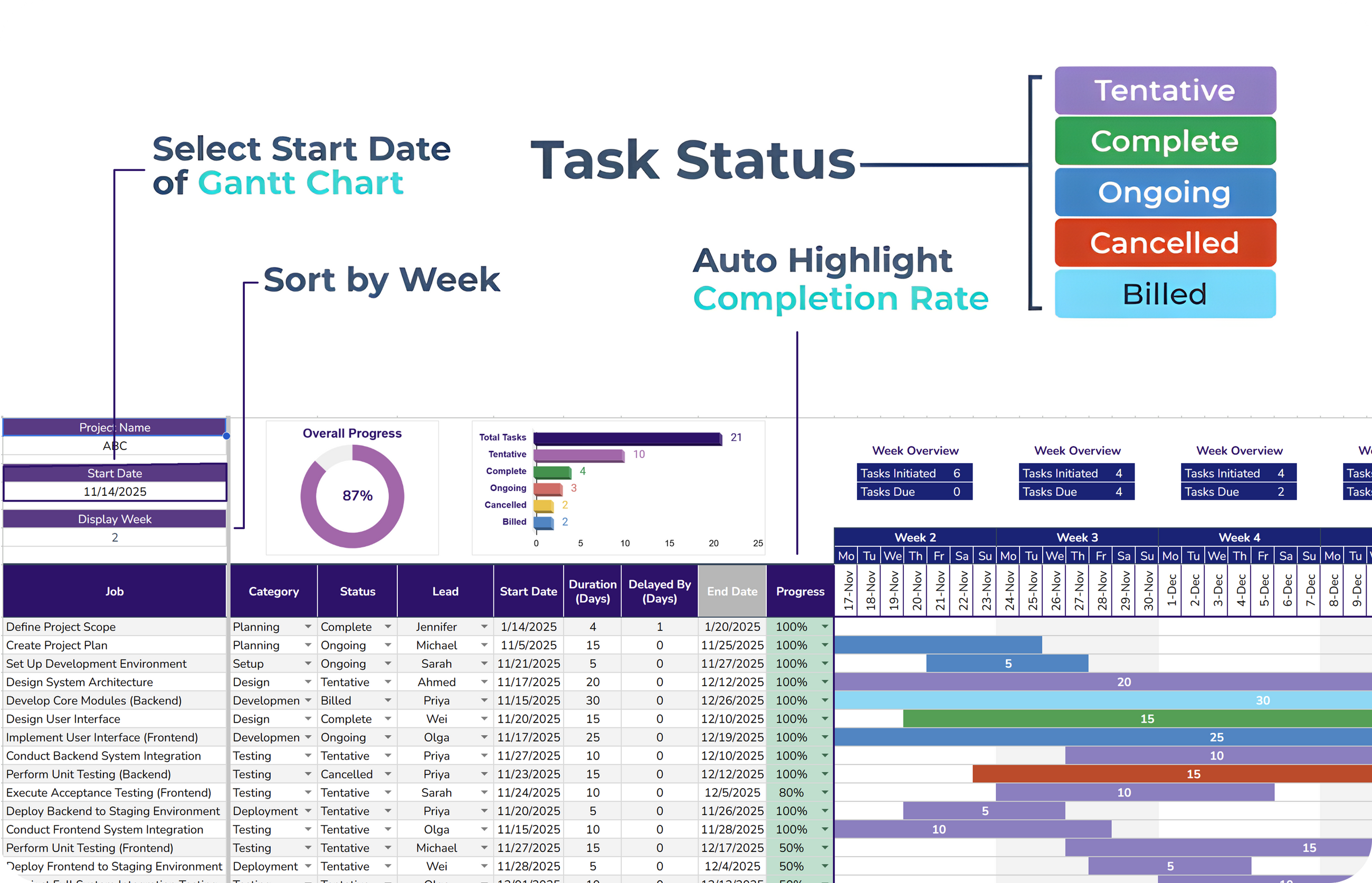 ✔ Dynamic Display: Customize the Gantt Timeline display by adjusting the week number.
