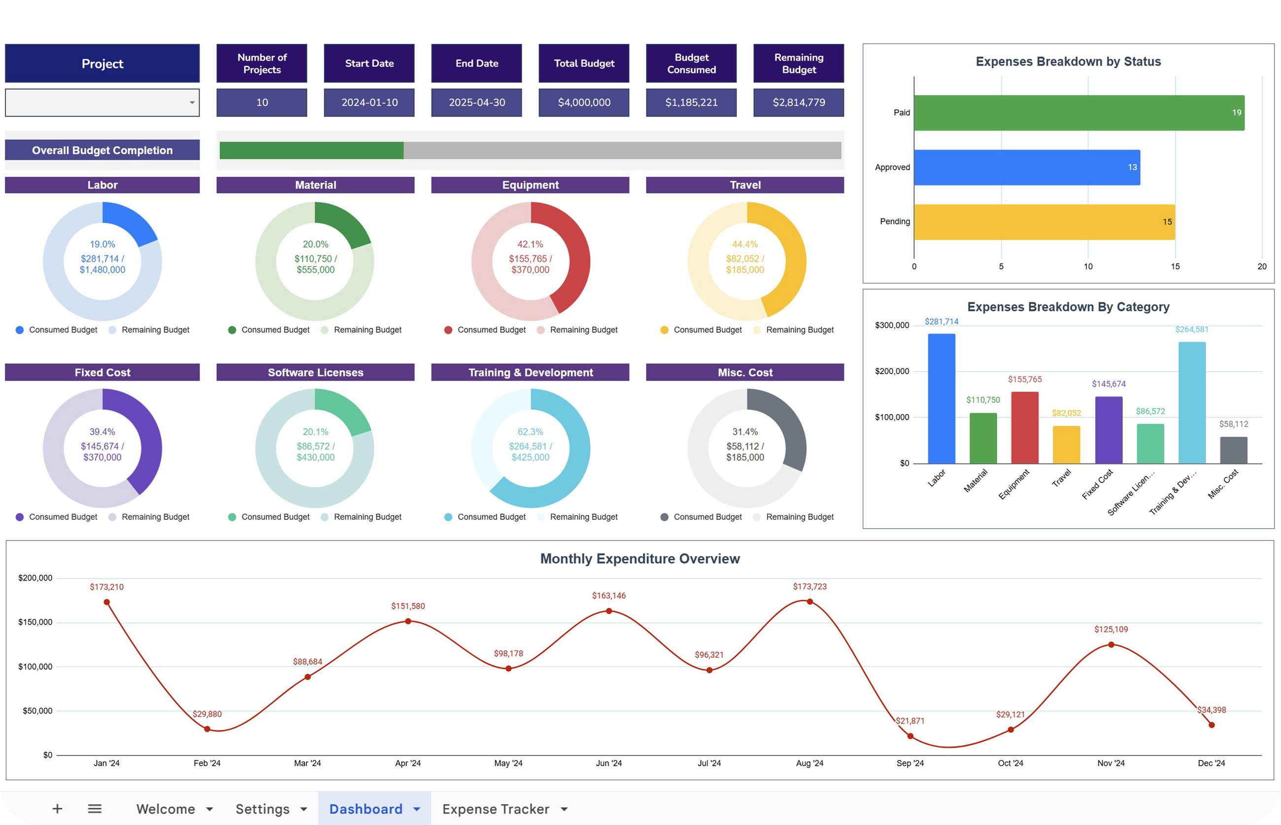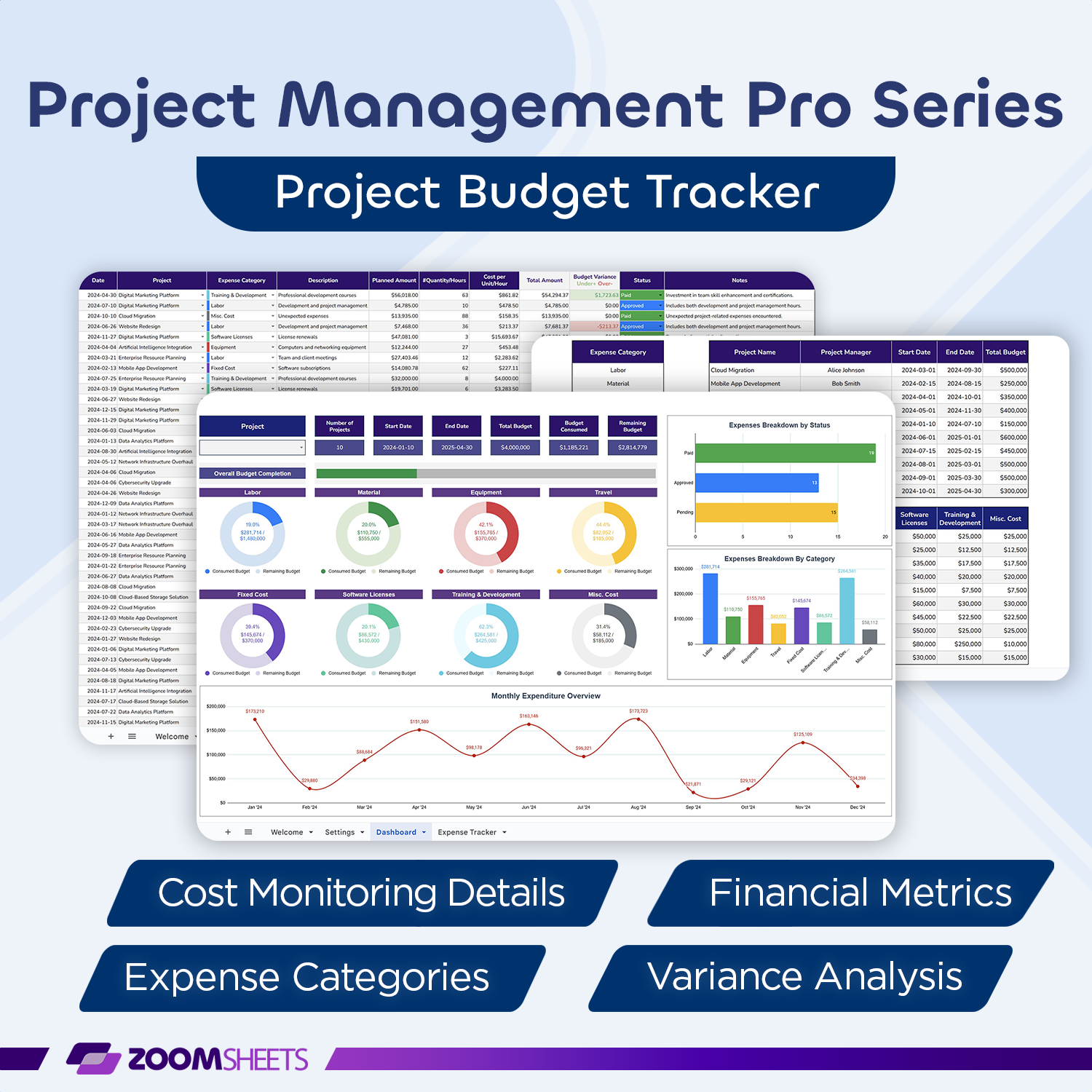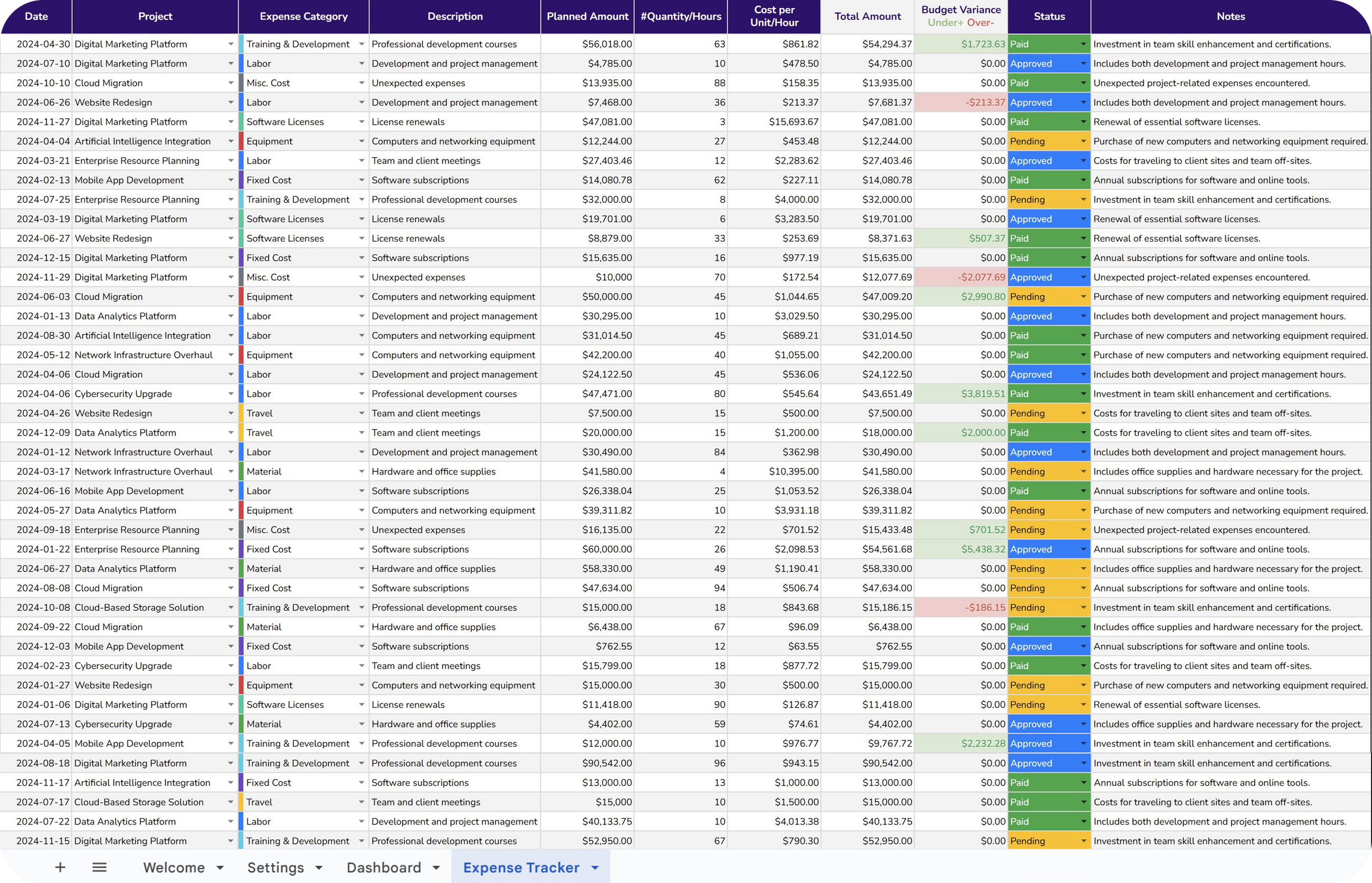 ✔ Budget Variance Analysis: Identify discrepancies with under/over indicators.