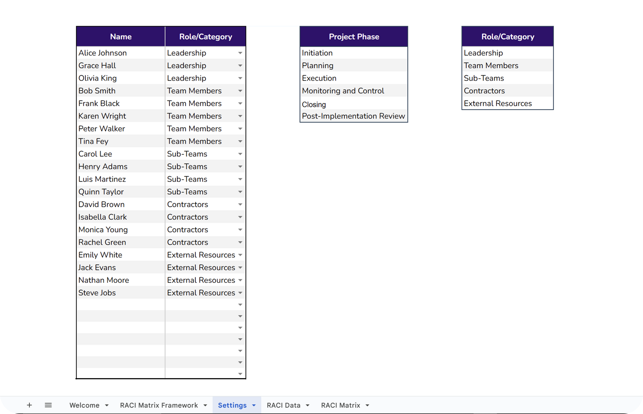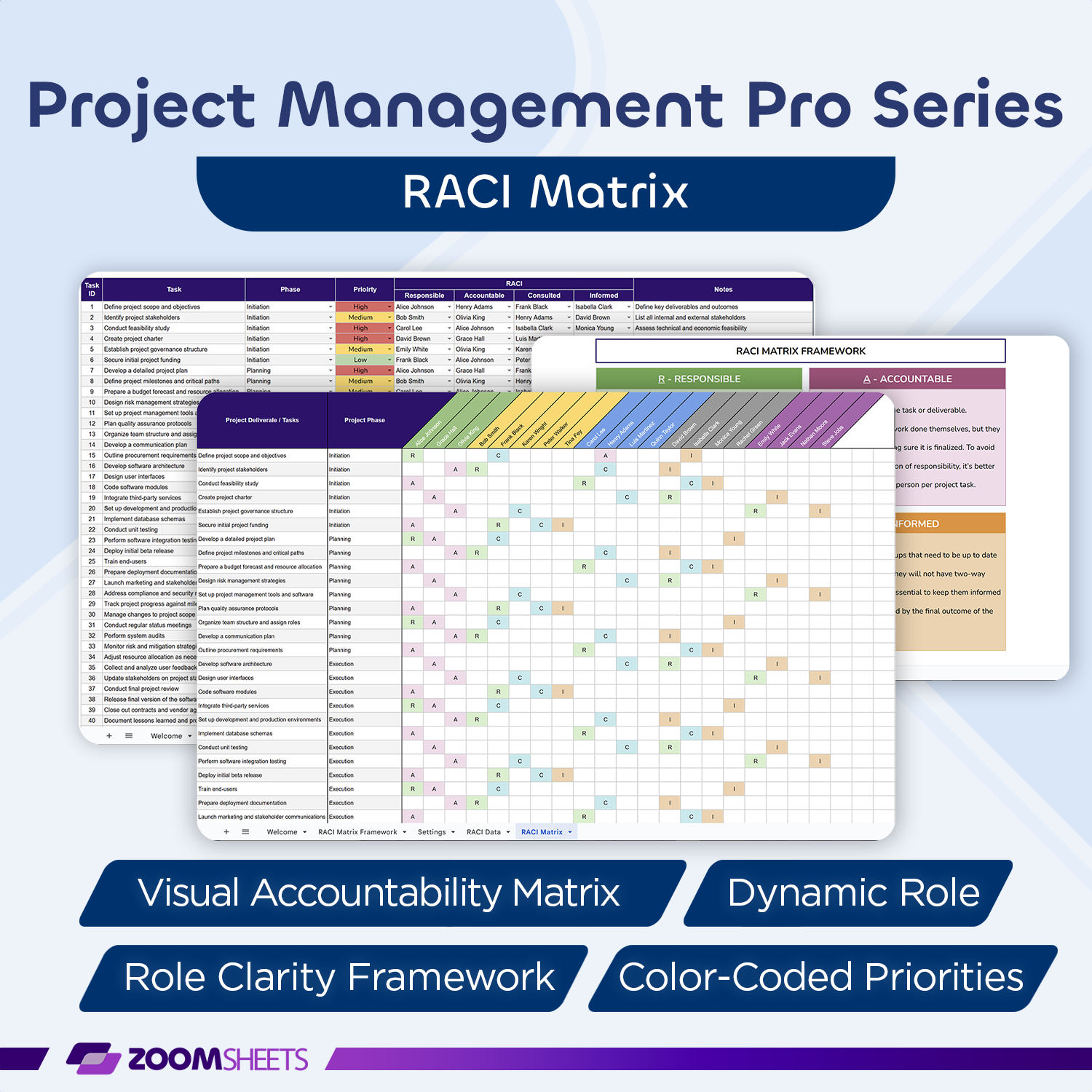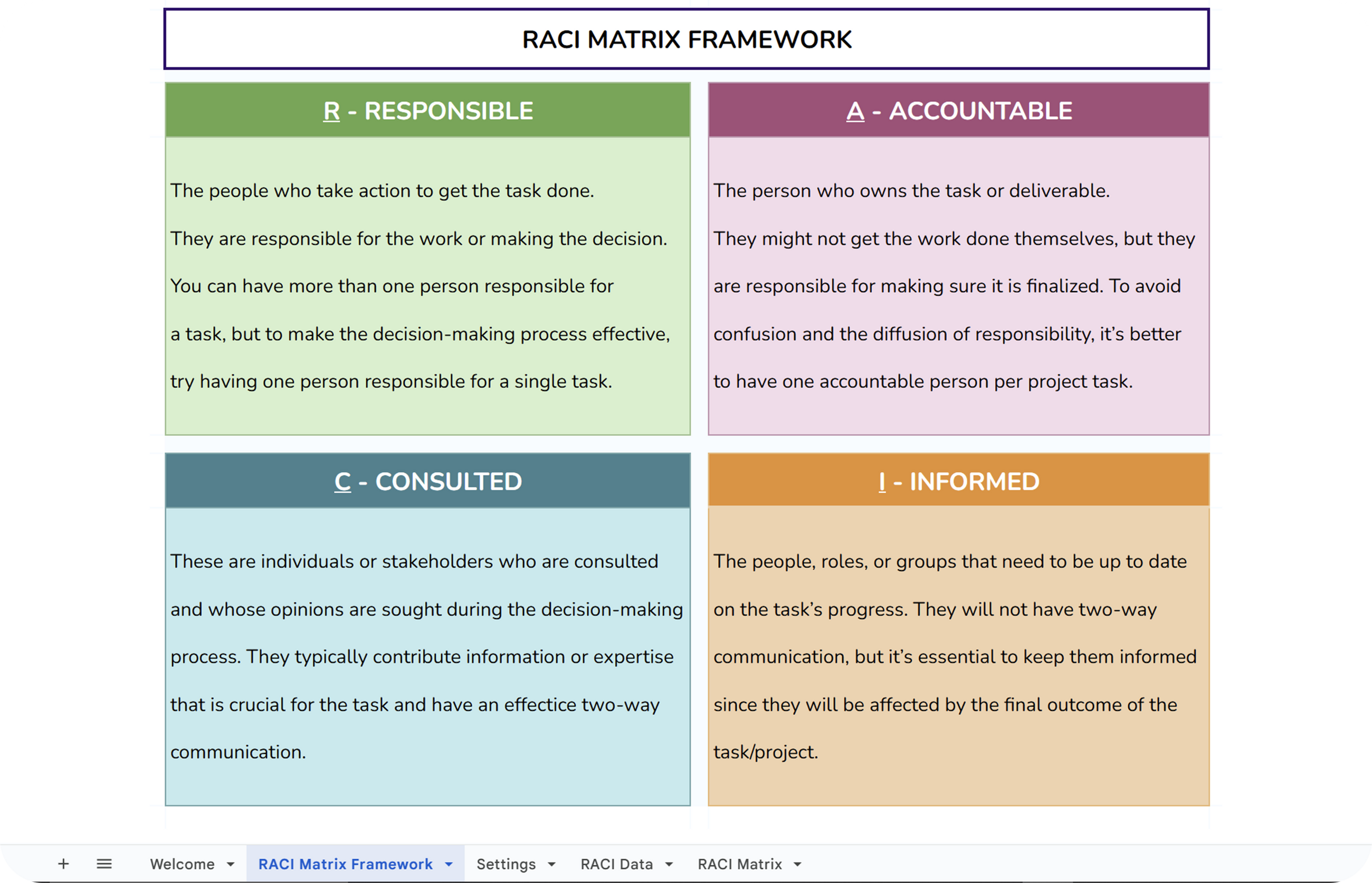 ✔ Color Distinctions: Highlight RACI roles with colours.