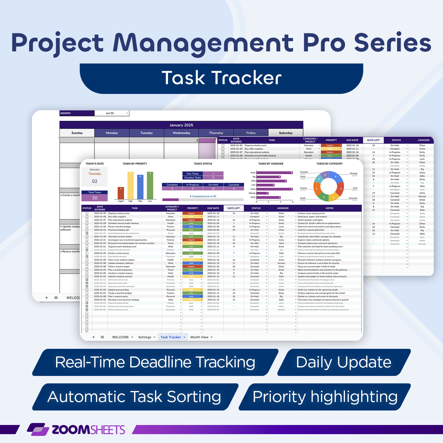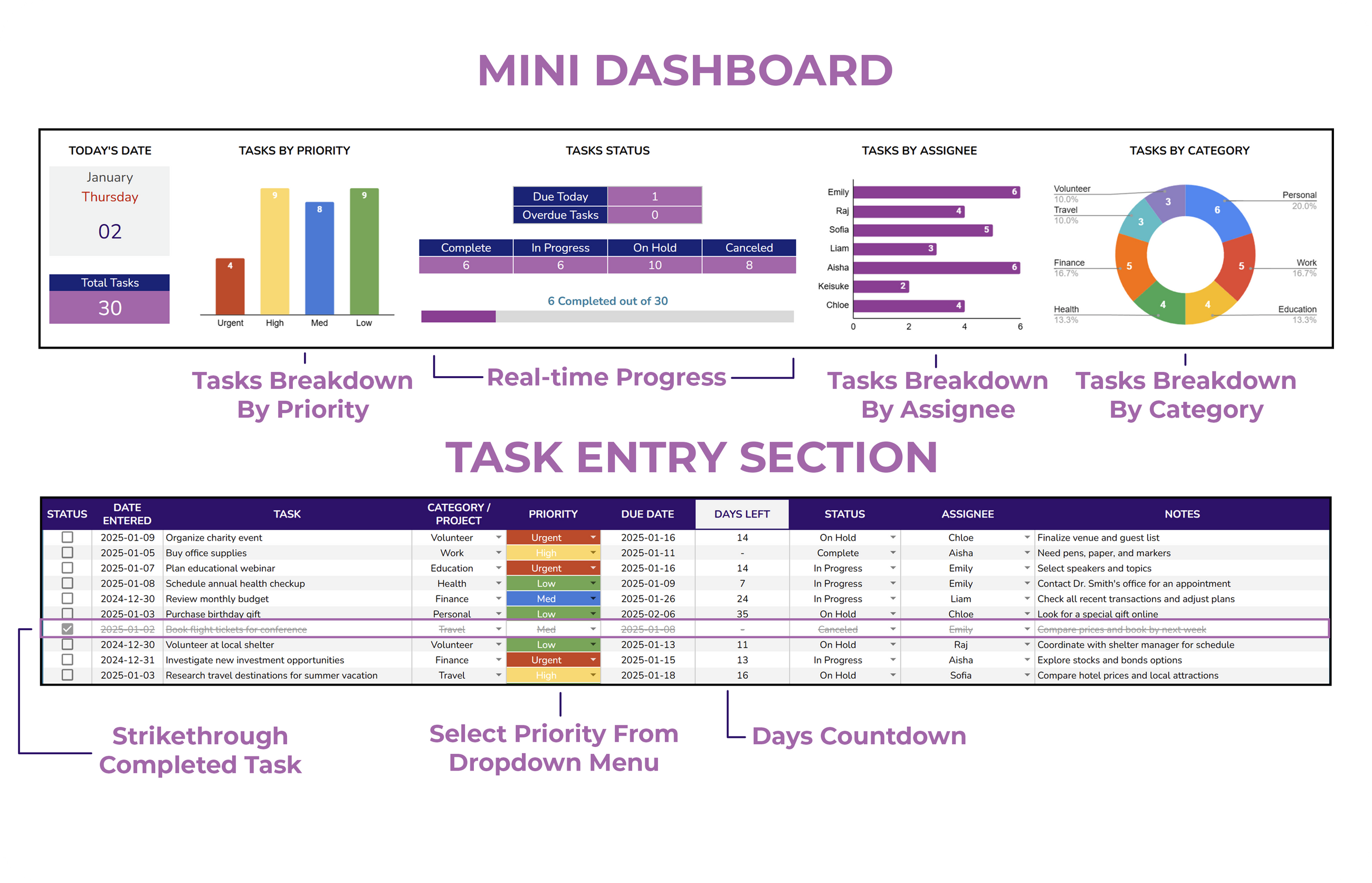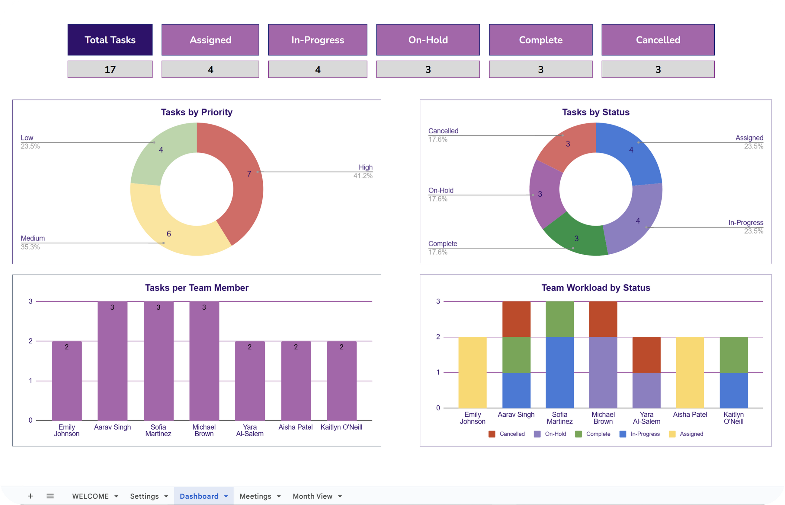 ✔ Priority & Assignee Charts: Analyze tasks by priority and assignee for balanced workload.