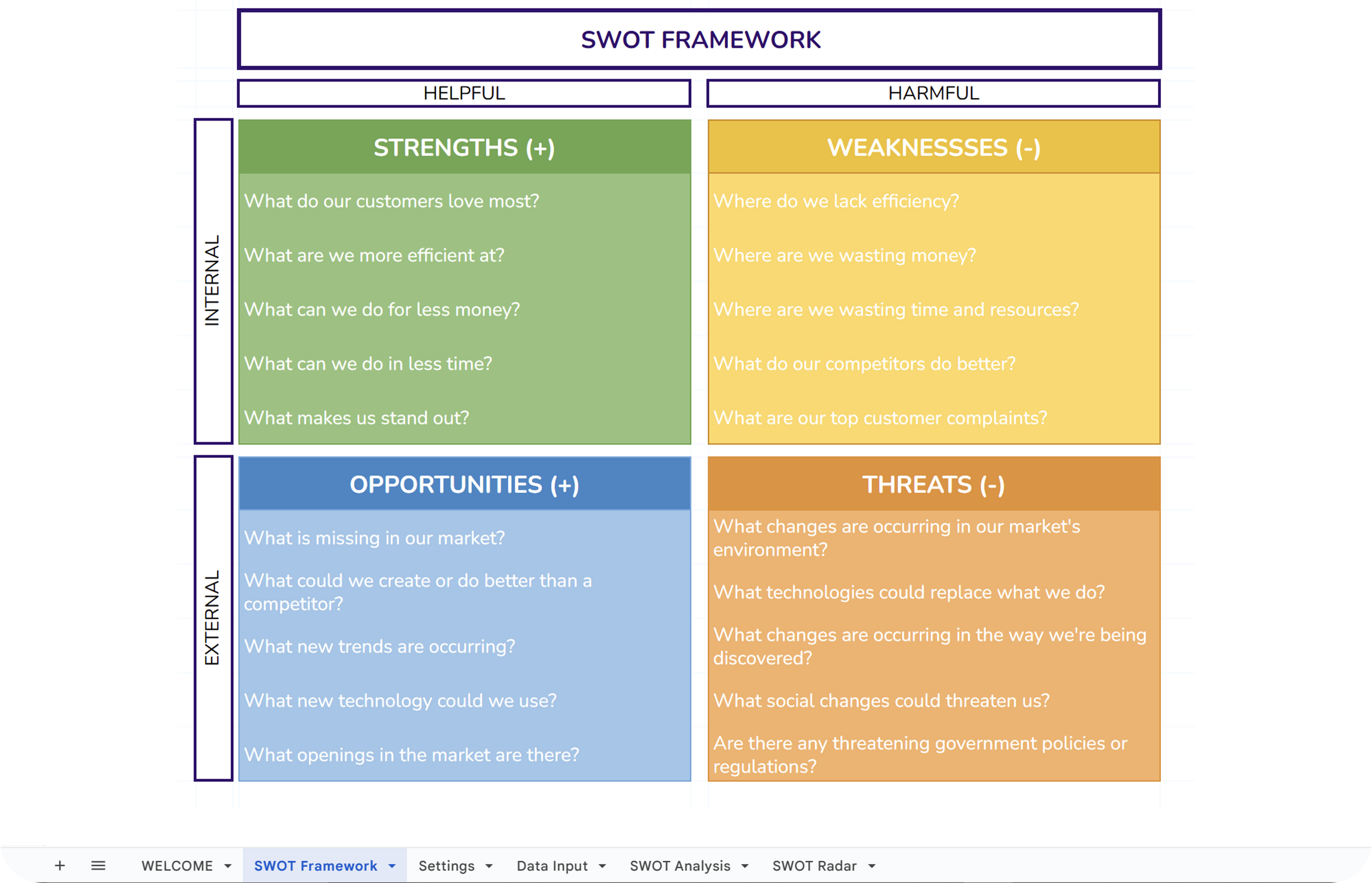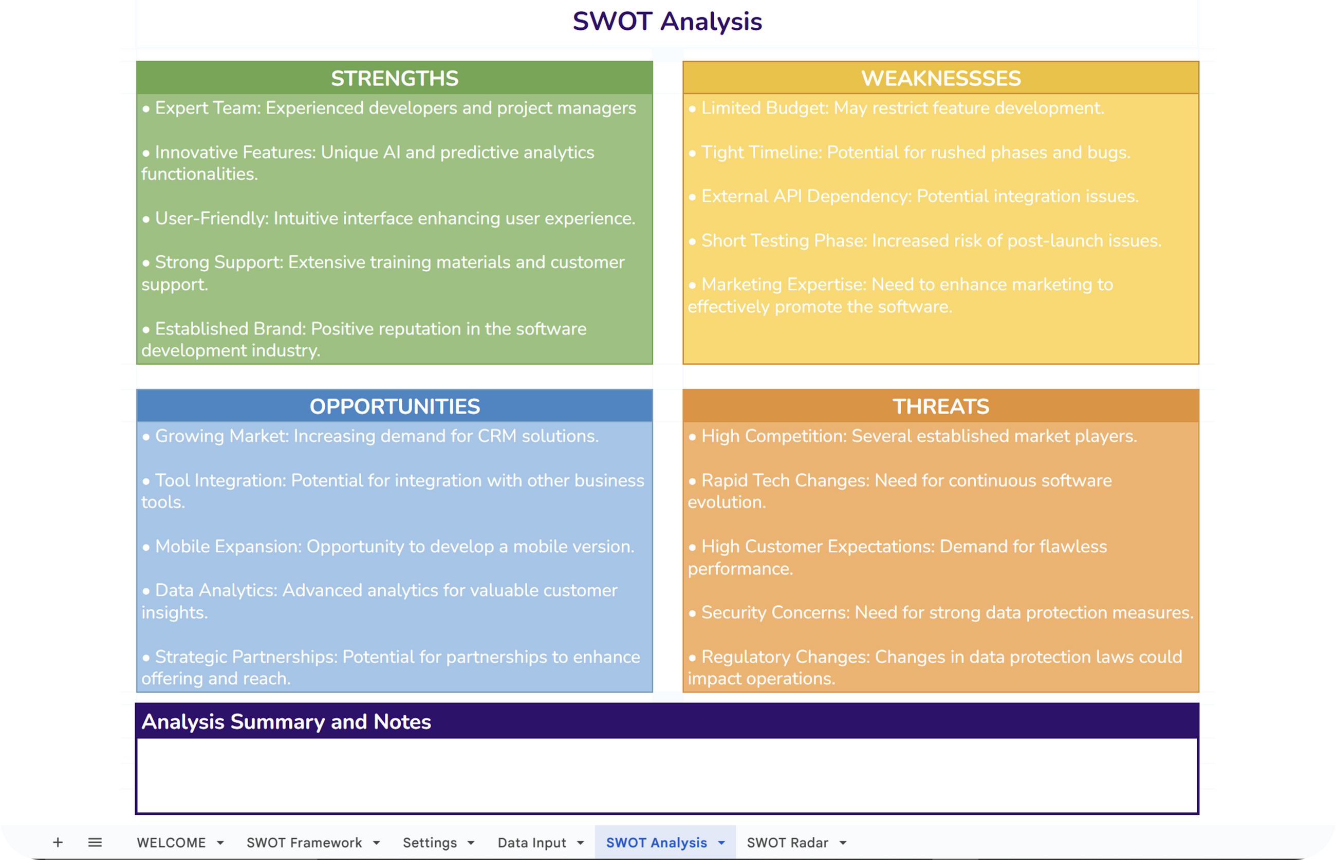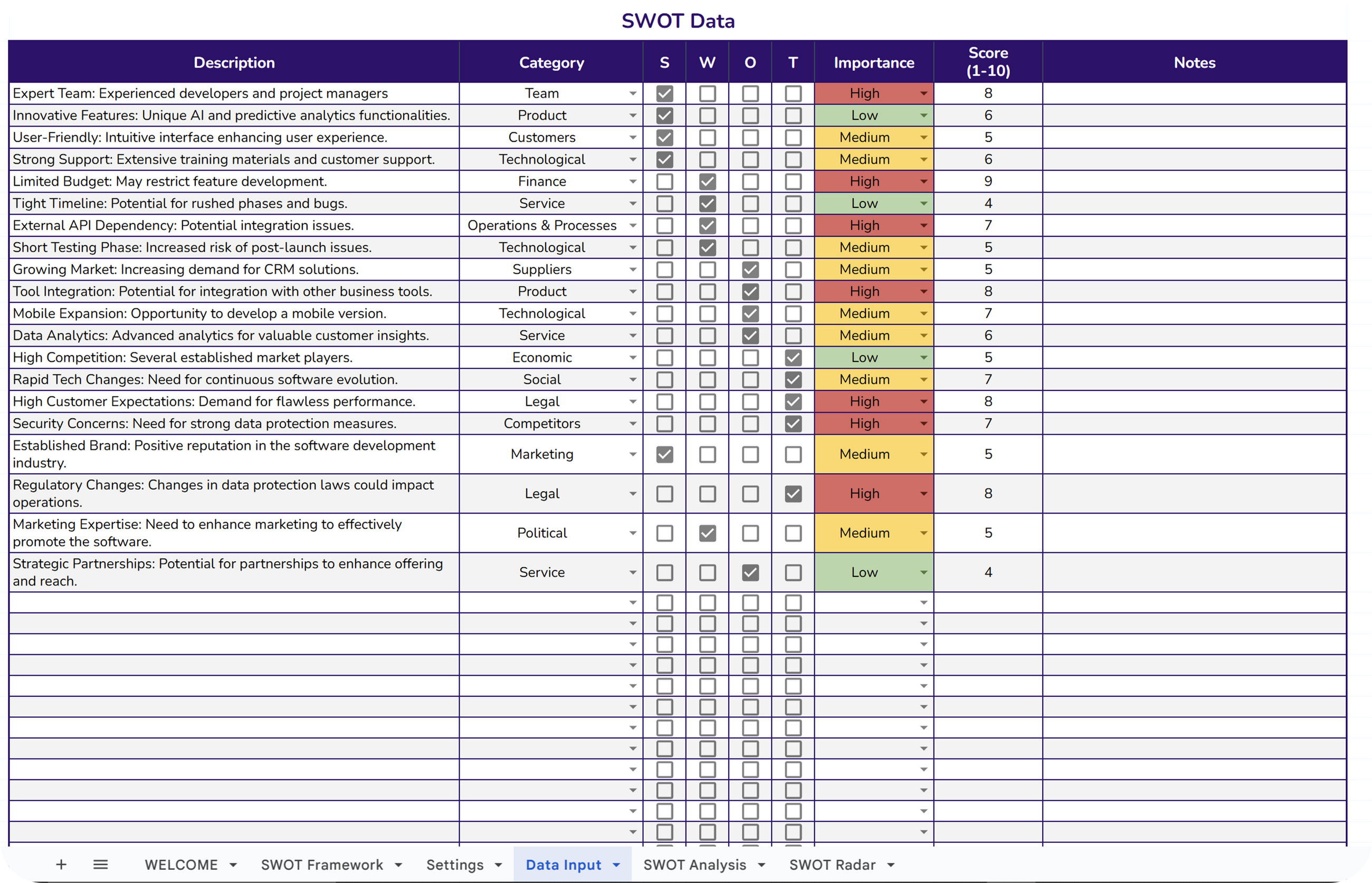 ✔ Structured Analysis: Detailed guidance for each SWOT element.