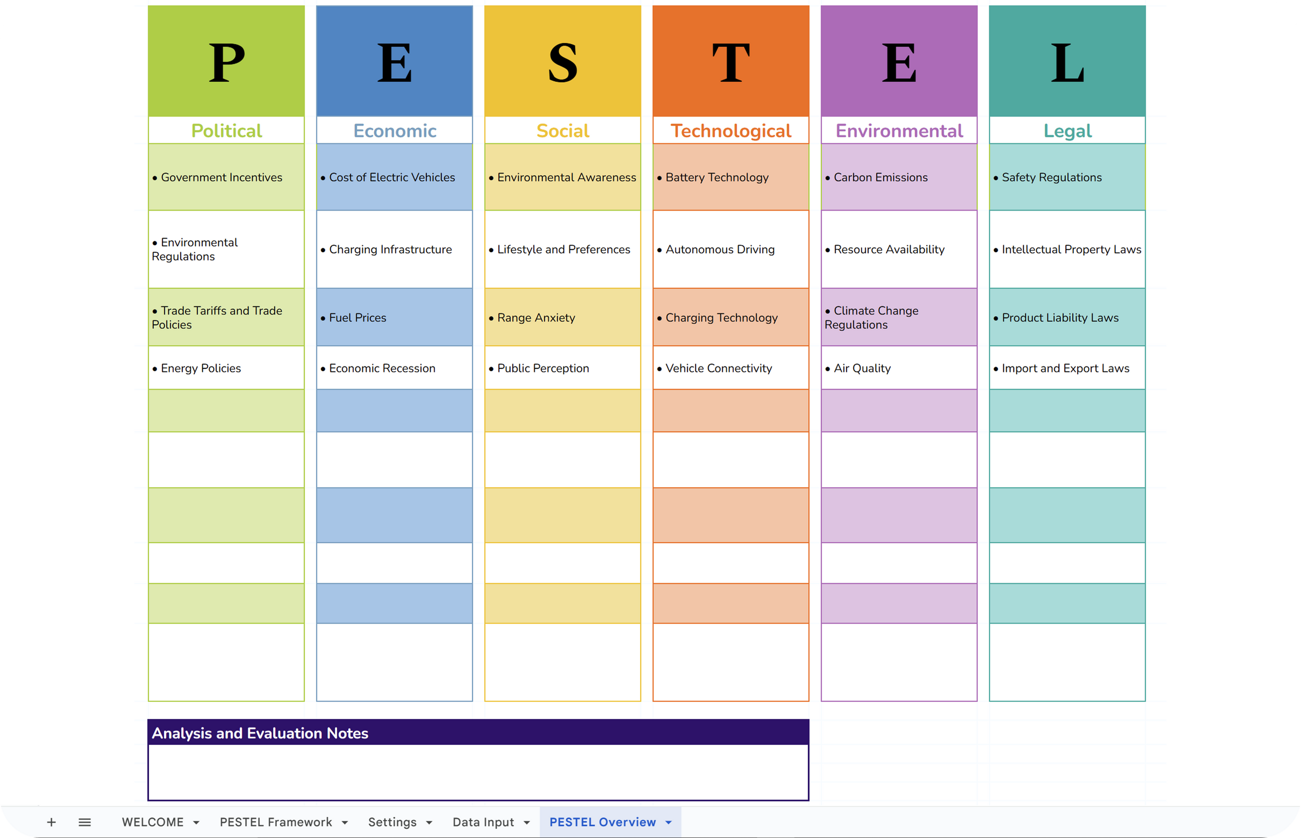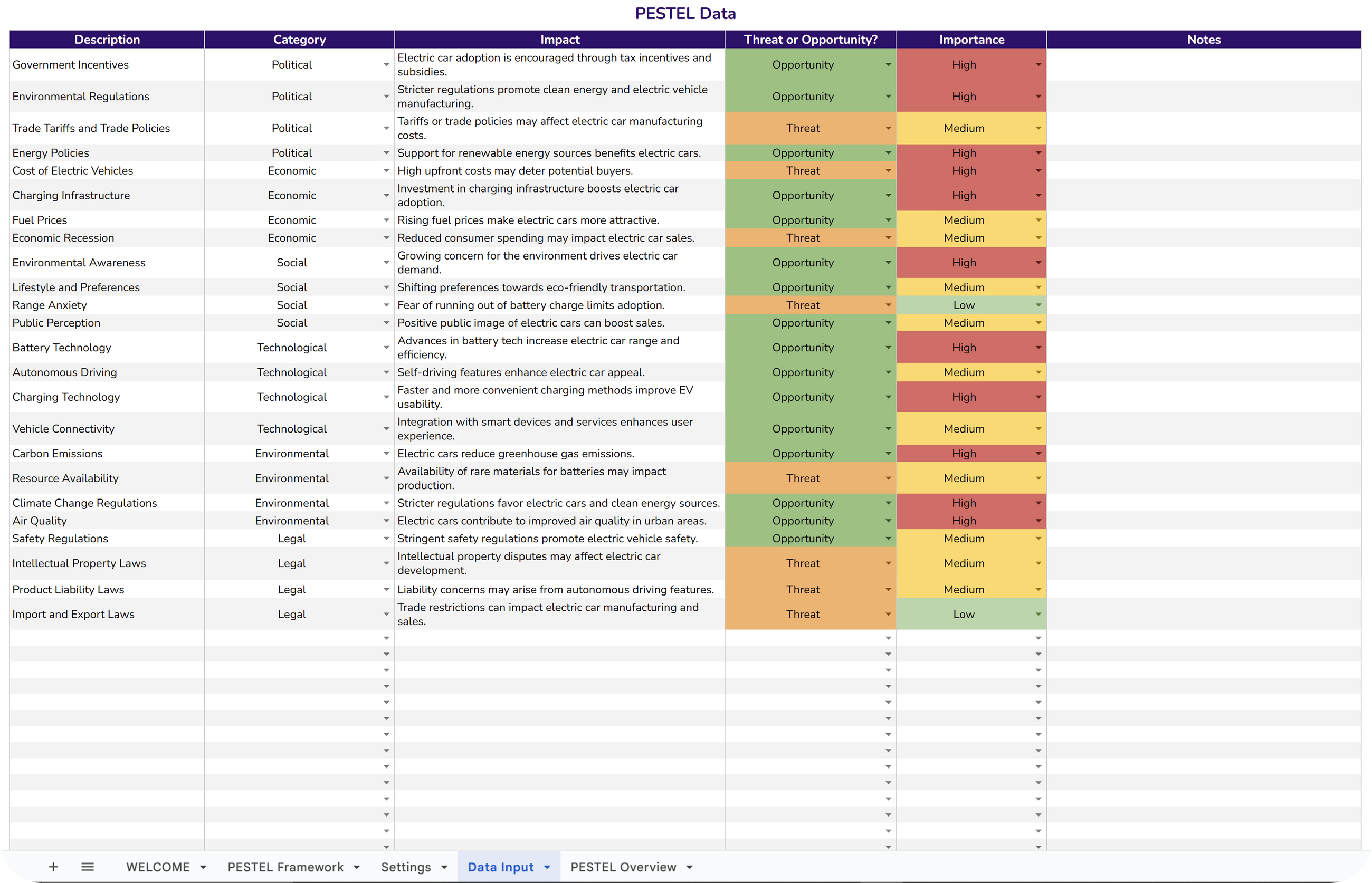 ✔ Detailed Entries: Input and detail specific PESTEL factors.