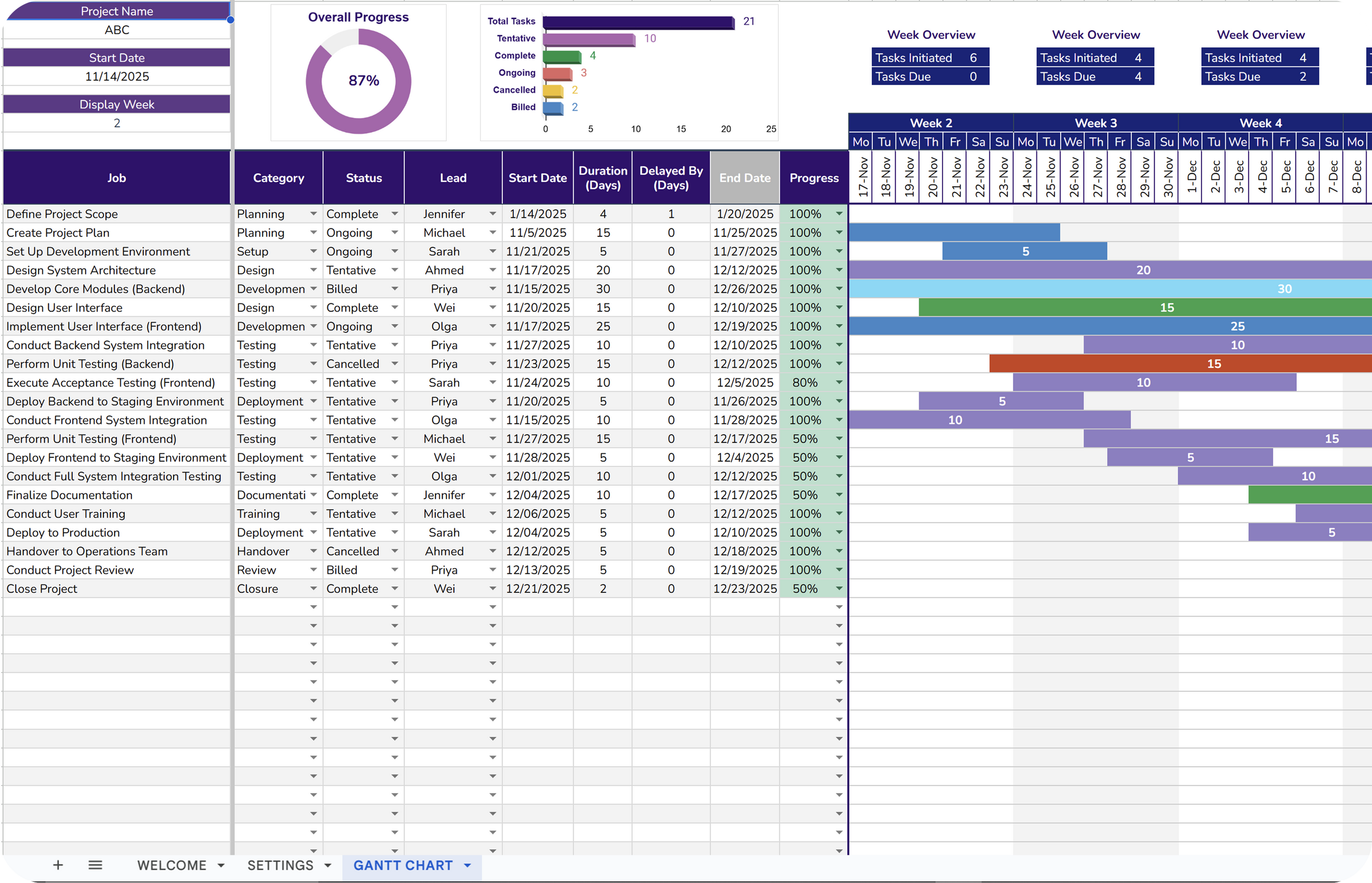 ✔ Weekly Metrics: Weekly initiated and due tasks displayed over the Gantt timeline.