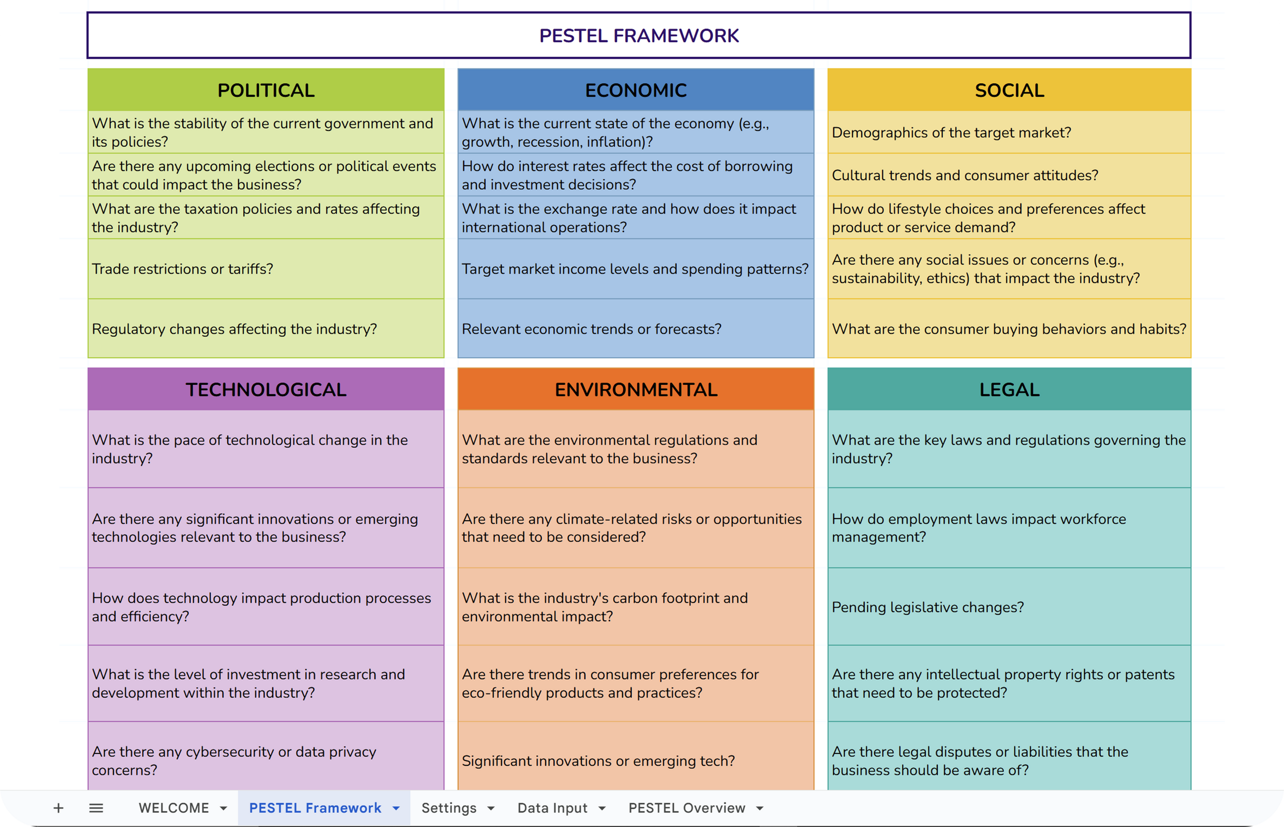 ✔ Framework Explanation: Detailed guidance on PESTEL aspects.