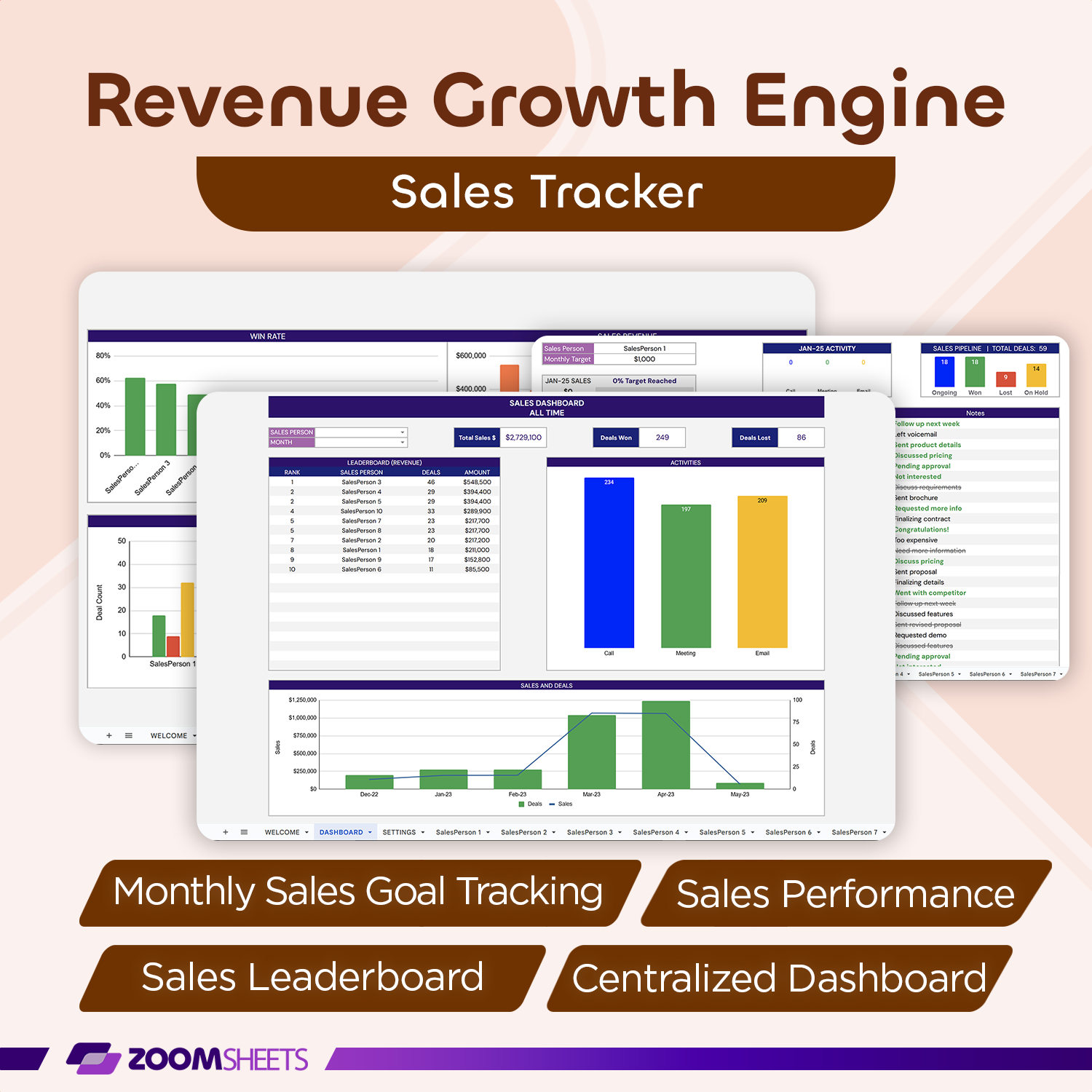 ✔ Revenue & Deals: Dynamic sections that show the total revenue in sales, number of deals won, and lost.