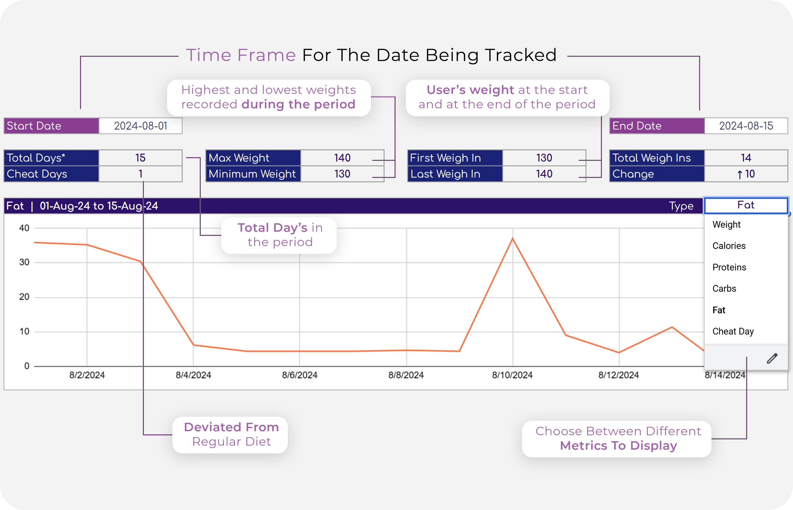 ✔ Monitor total days, cheat days, and weigh-ins.