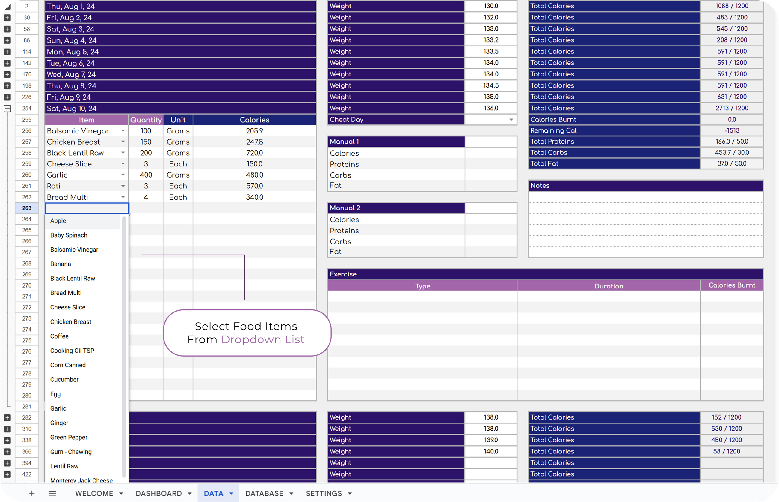 ✔ Log meals, exercises, and notes all in one place.