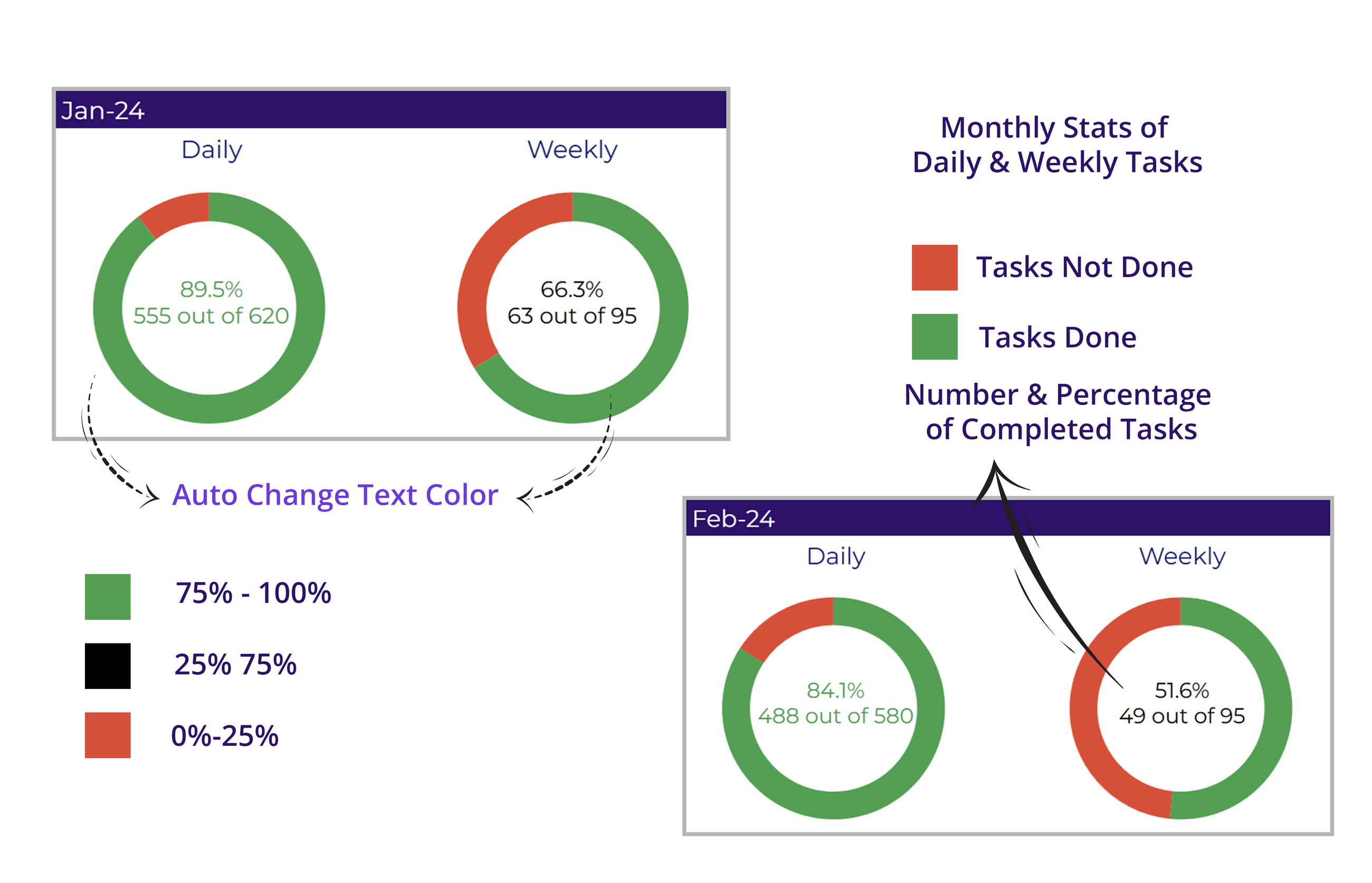 ✔ Keep an eye on monthly progress with stats on daily and weekly tasks, including completed tasks out of total and percentage completed.