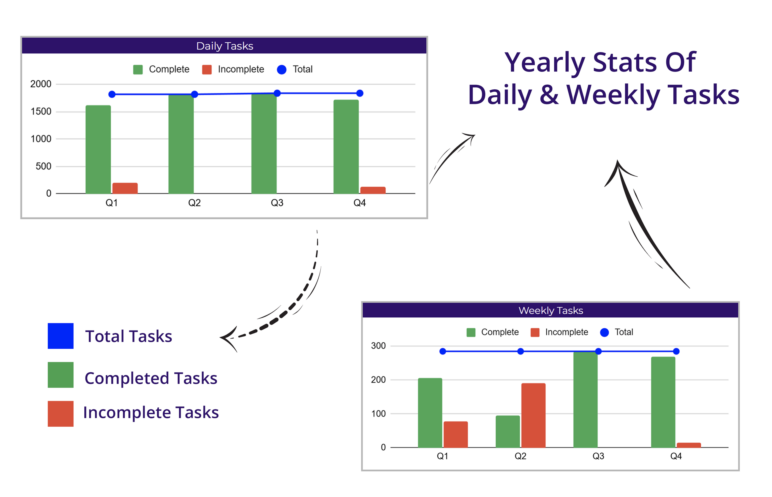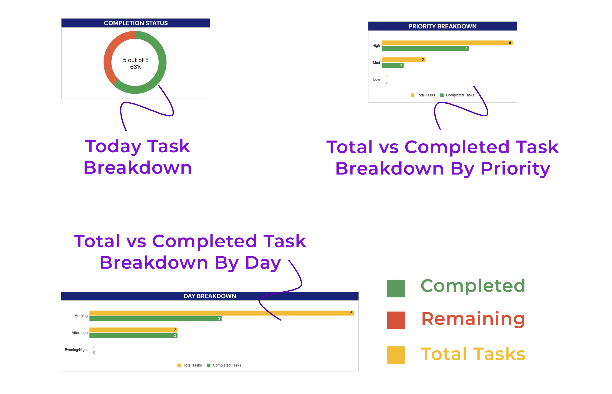 ✔ Evaluate daily tasks trend with a bar chart visualizing completed, incomplete, and total tasks.