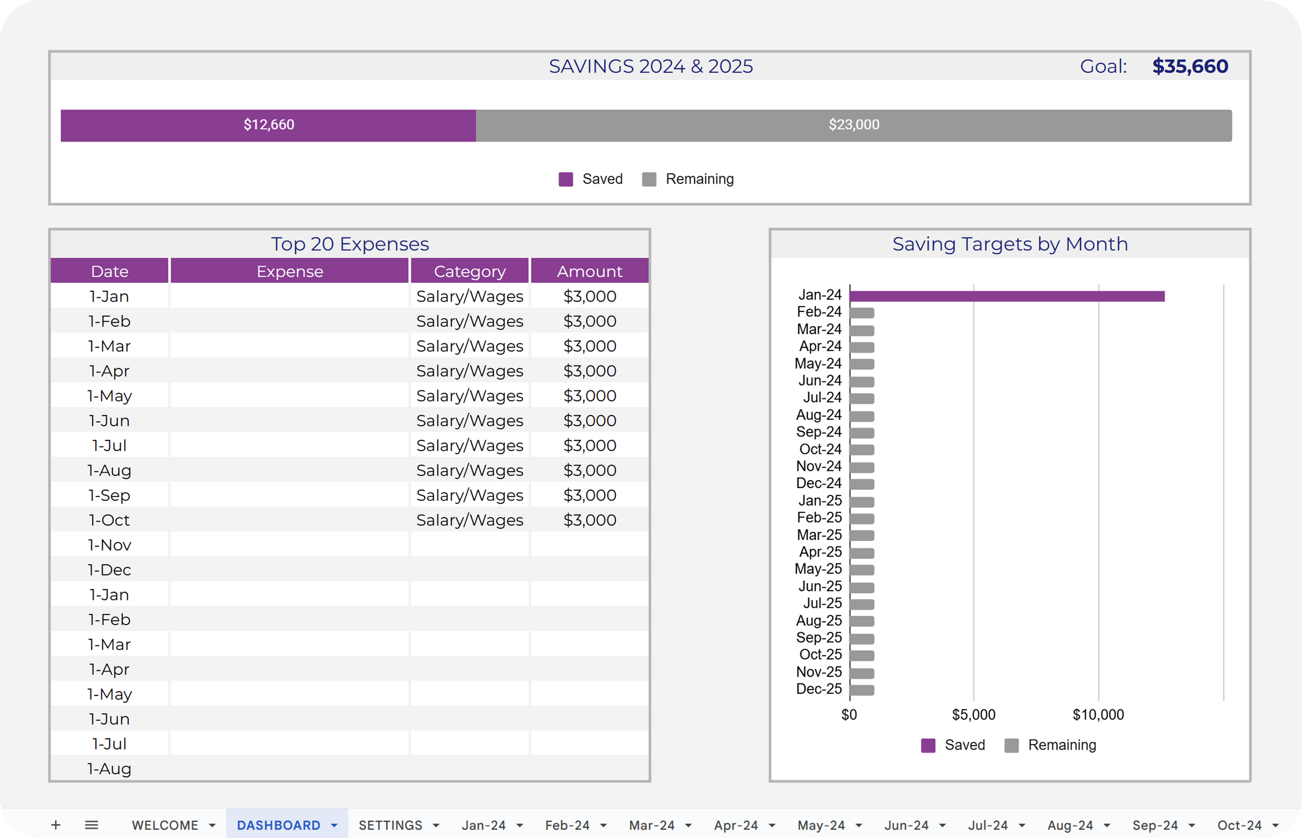 ✔ Compare saving targets with actual achievements using individual progress bars.