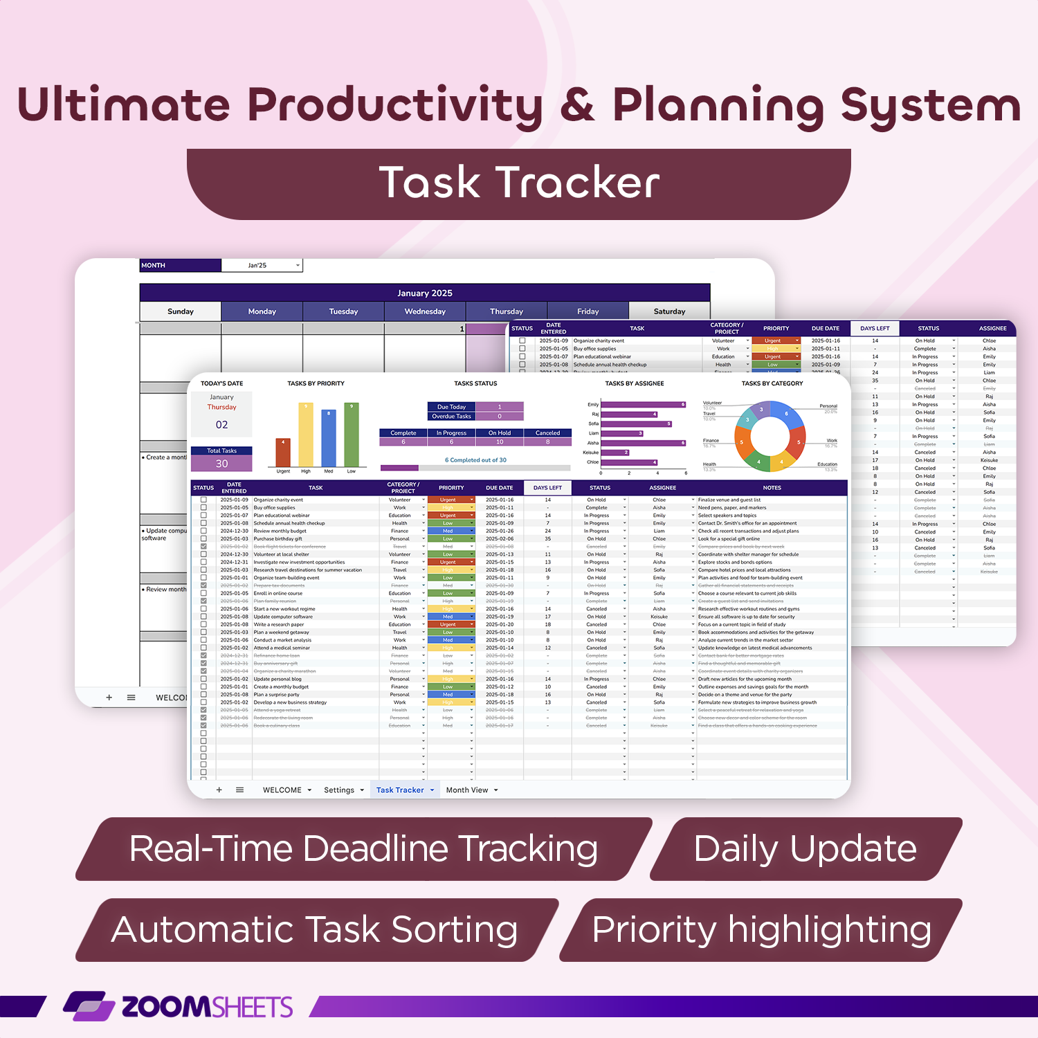 ✔ Priority & Assignee Charts: Analyze tasks by priority and assignee for balanced.