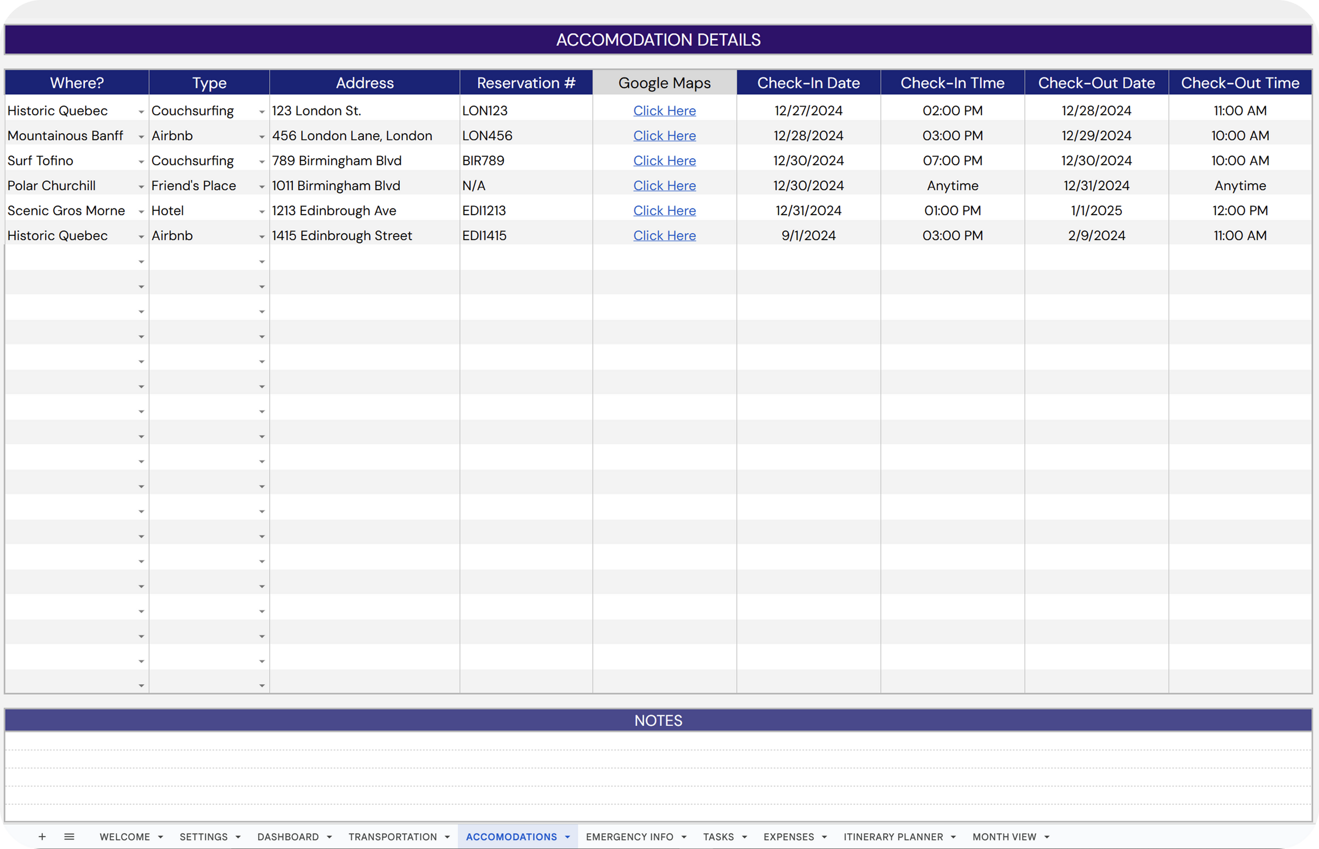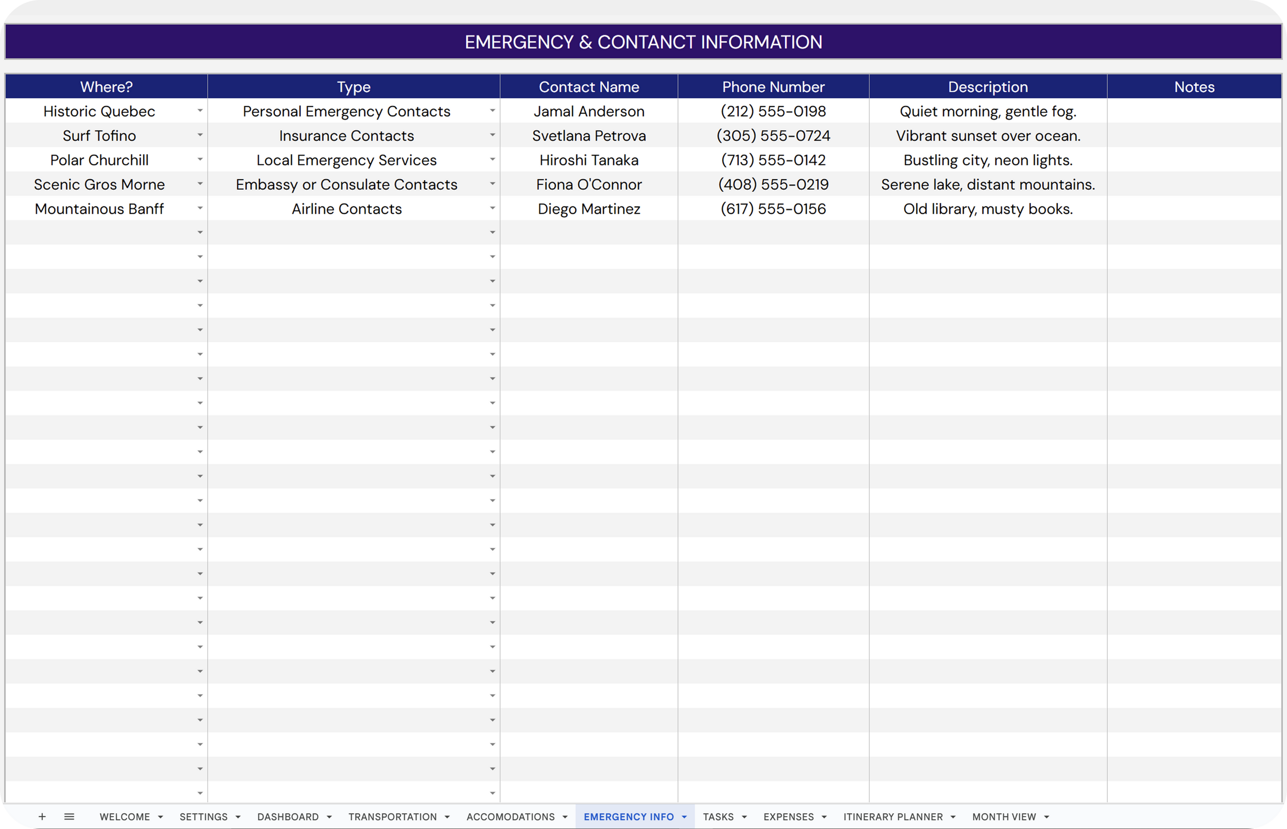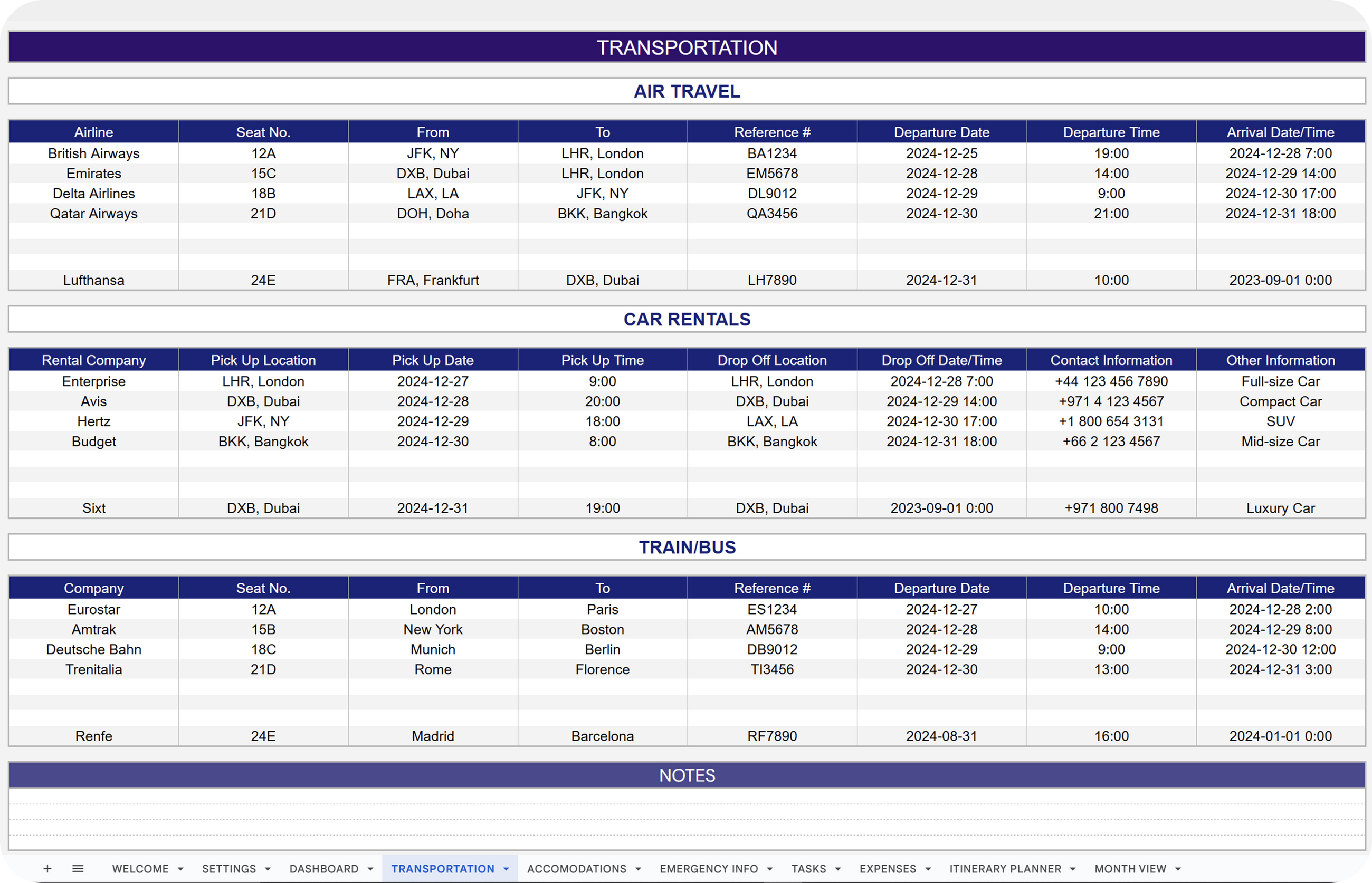 ✔ Car Rentals: Log and monitor car rental information.