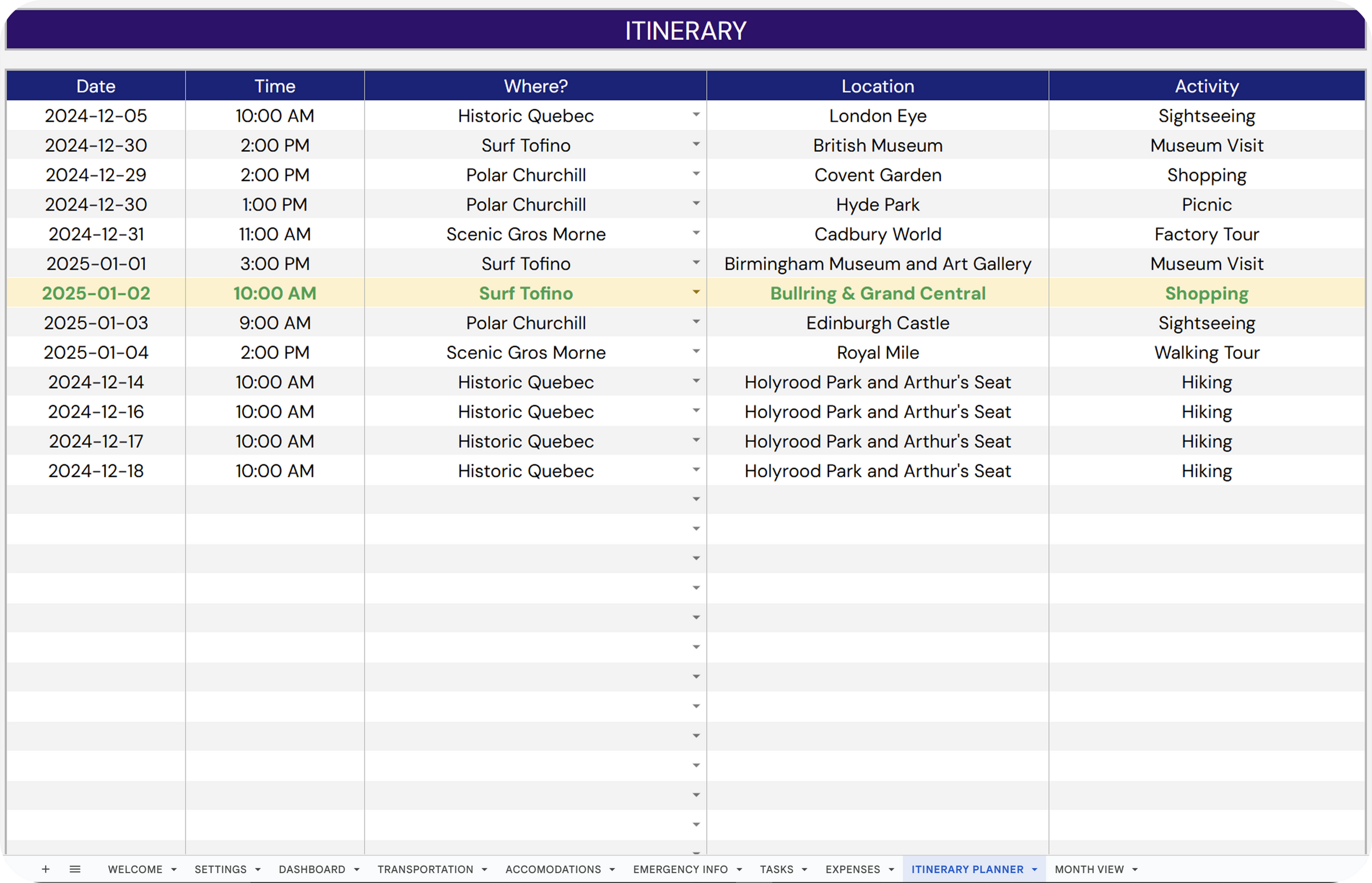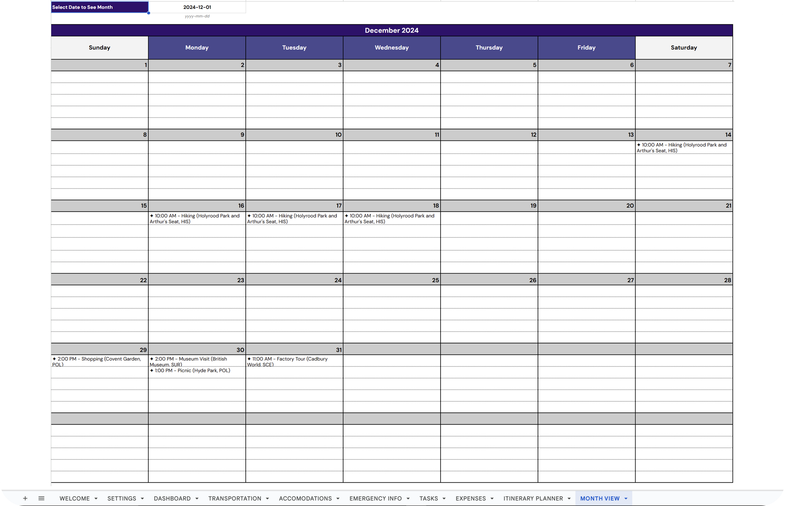 ✔ Upcoming Events: Track transport, stays, activities.