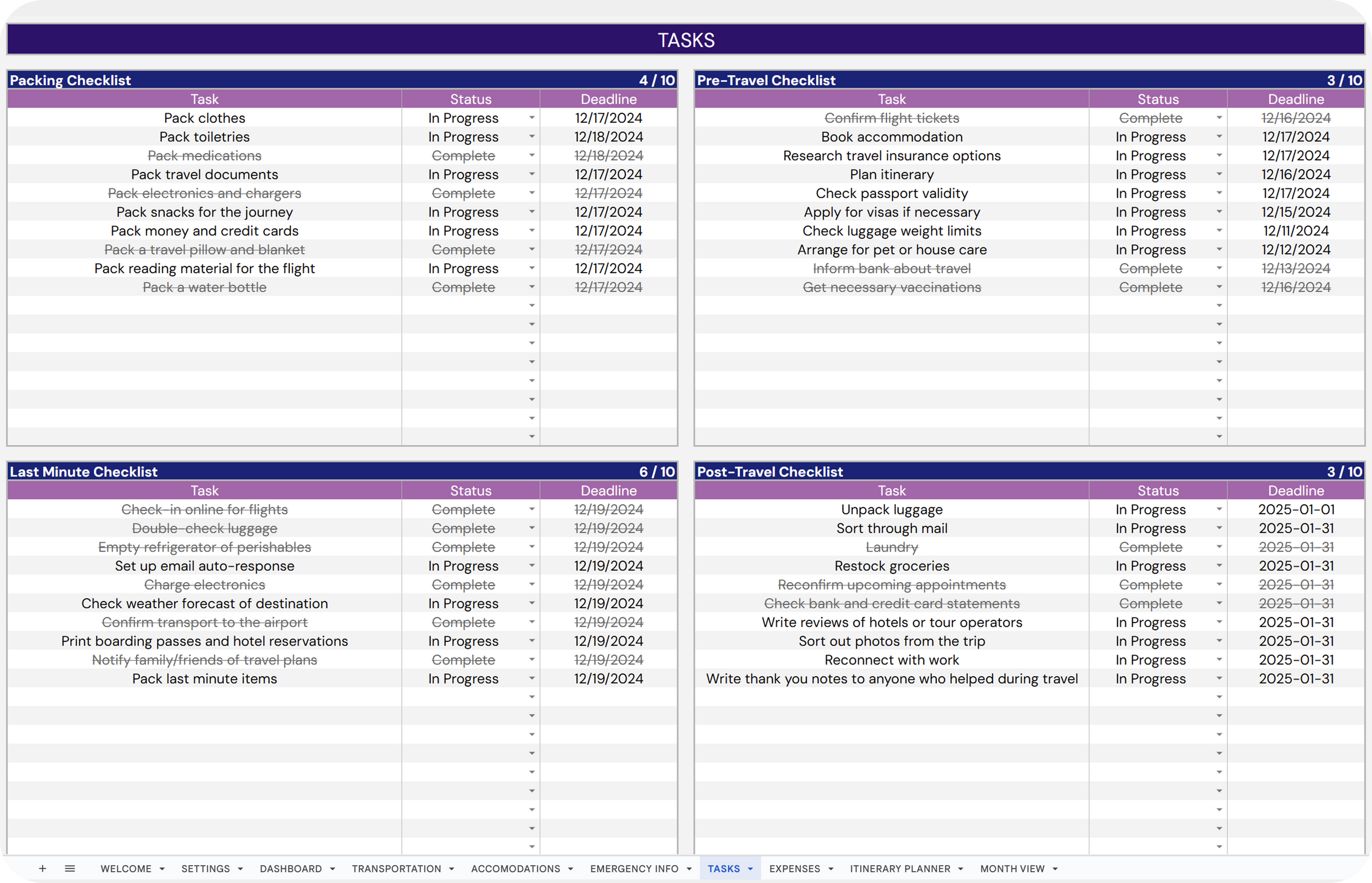 ✔ Post-Travel Checklist: Track and complete post-travel tasks.